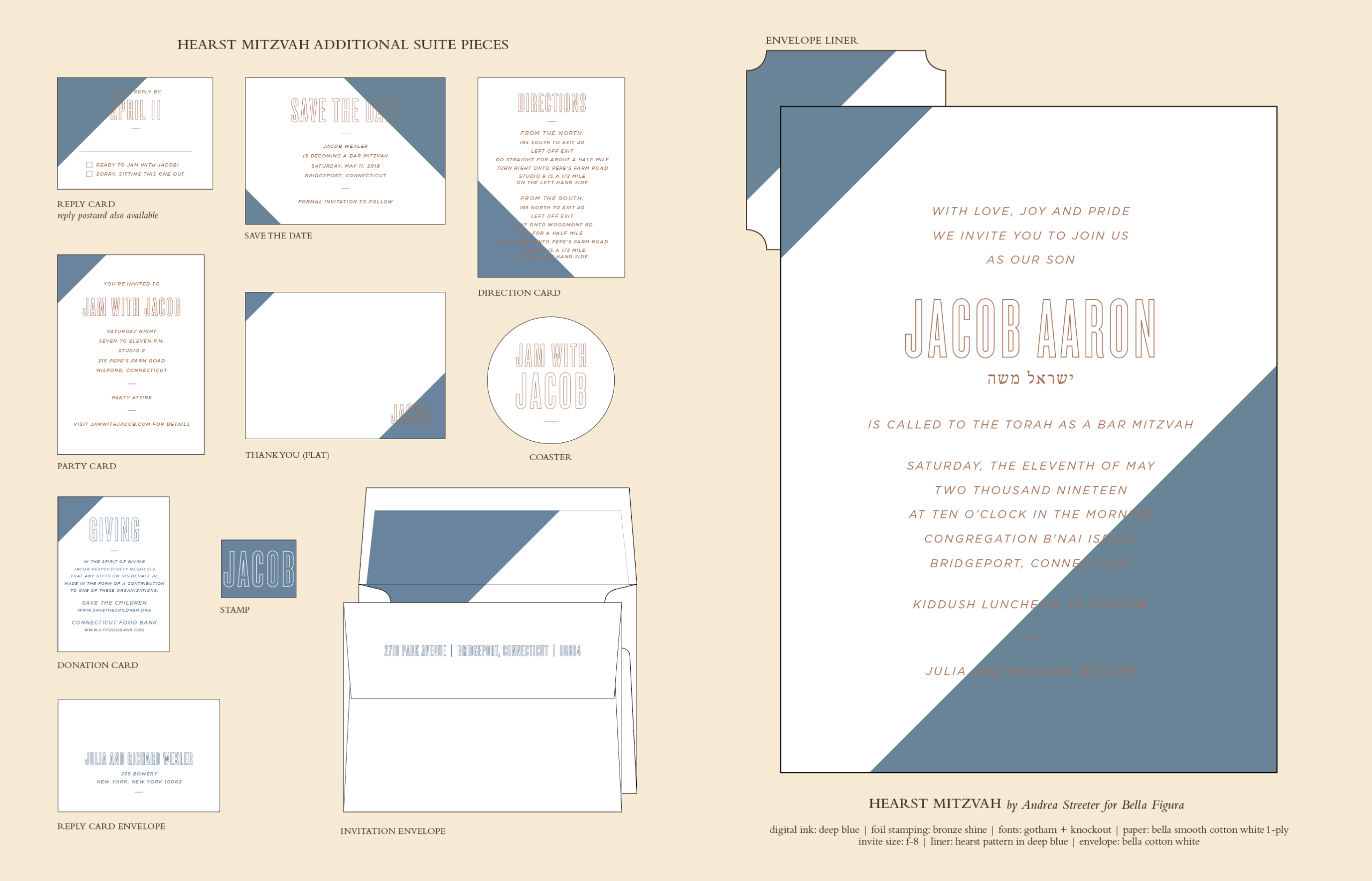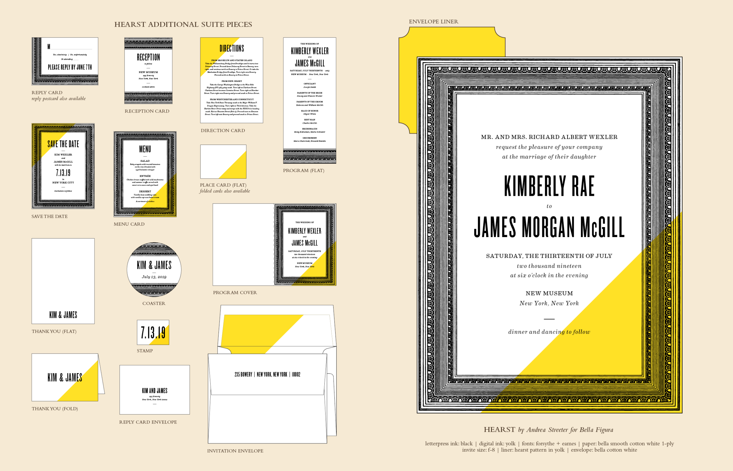 Wedding Invitations by Andrea Streeter for Bella Figuraletterpress ink: black | digital ink: yolk | fonts: forsythe + eames | paper: bella smooth cotton white 1-ply | invite size: f-8 | envelope liner: custom hearst pattern in yolk | envelope: bella cotton white