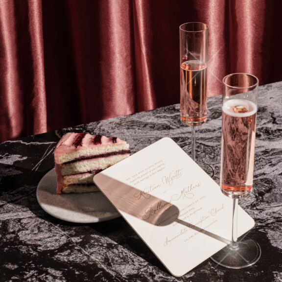 Wedding Invitations by Racheal Bumbolo for Bella Figuraengraving inks: metallic champagne + spruce | digital inks: spruce + sand | fonts: sweet gothic + rose orchard garden + adobe caslon italic | paper: bella smooth cotton white 2-ply + bella smooth cotton white 1-ply (gatefold + pocket + tag) | invitation size: f-8 for pocketfold (tier 3) | bevel: 45ยบ custom | edge painting: metallic champagne | gatefold size: 6.24 x 8.31 folded | pocket size: 3.5 x 5.19 | diecut style: ps-516 | tag size: 2.5 x 3.19 (tier 1) | diecut style: bf-167 | digital liner: hettie pattern in spruce + sand | envelope: almond | digital addressing: vine