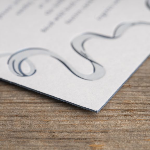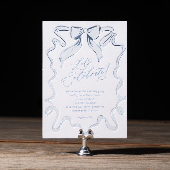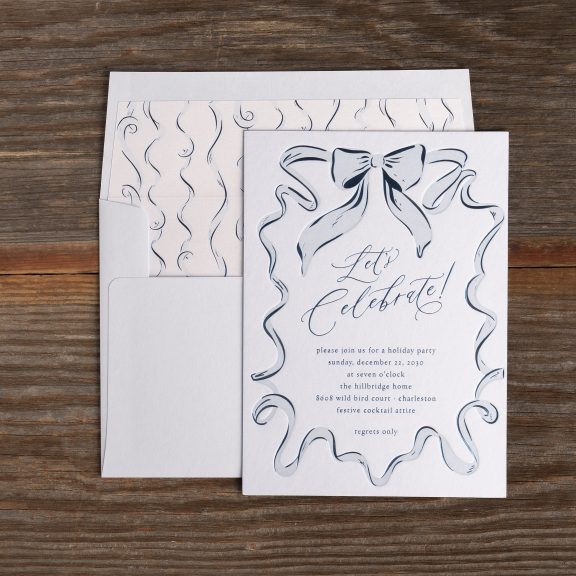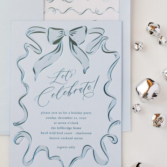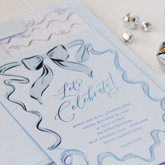 Holiday Cards by Katie Magee for Bella Figuraletterpress ink: powder blue | foil stamping: frost shine | fonts: gathering script + hoefler text | paper: sky 2-ply | card size: a-7 (tier 3) | foil edging: frost shine | liner: hillbridge pattern in frost shine + powder blue on metallic crystal text | envelope: sky | digital addressing inks: wedgewood + powder blue