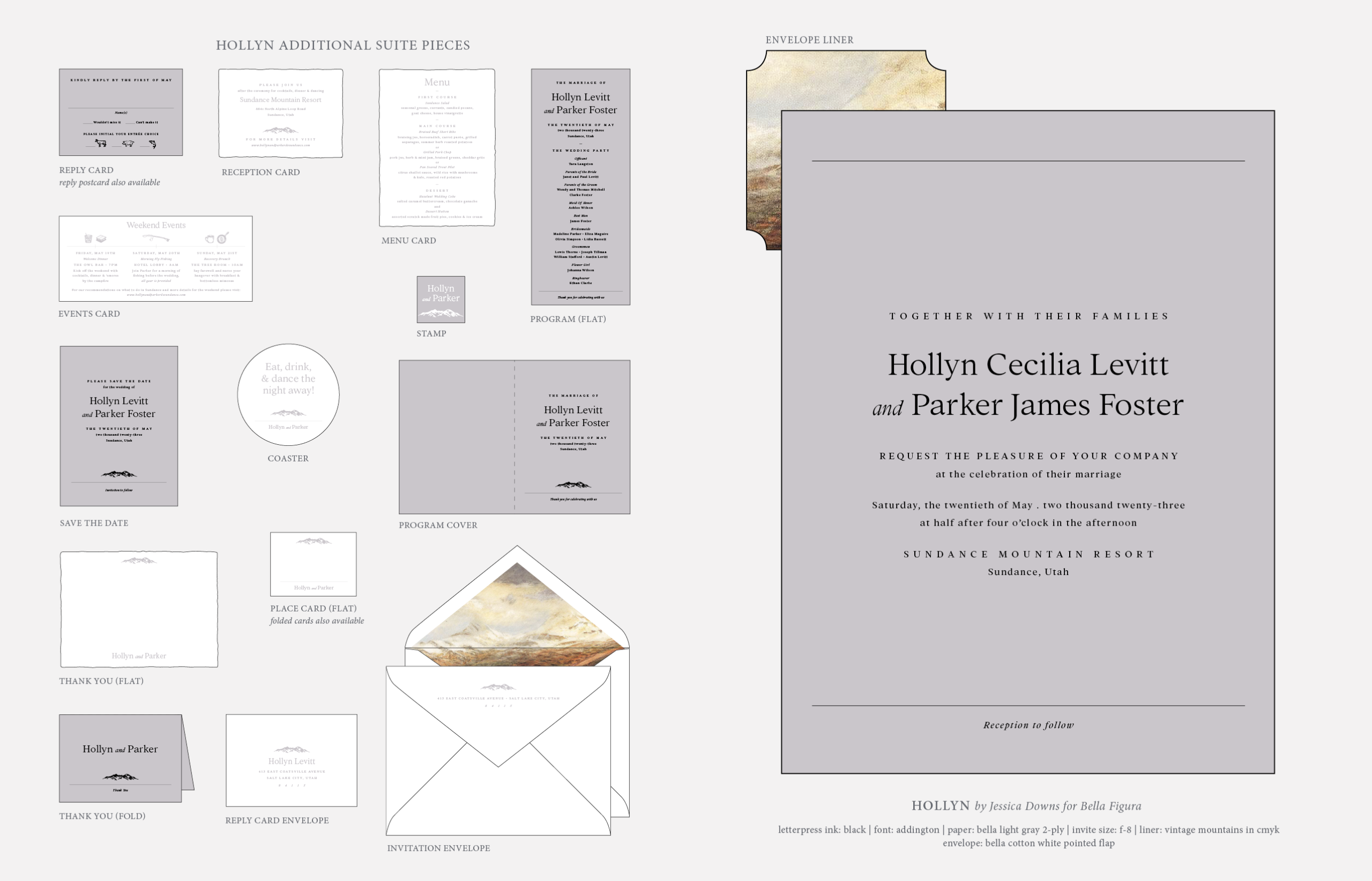Retired Designs by Jessica Downs for Bella Figuraletterpress ink: black | font: addington | paper: bella light gray (now pebble) 2-ply | invite size: f-8 | liner: vintage mountains in cmyk | envelope: bella cotton white pointed flap