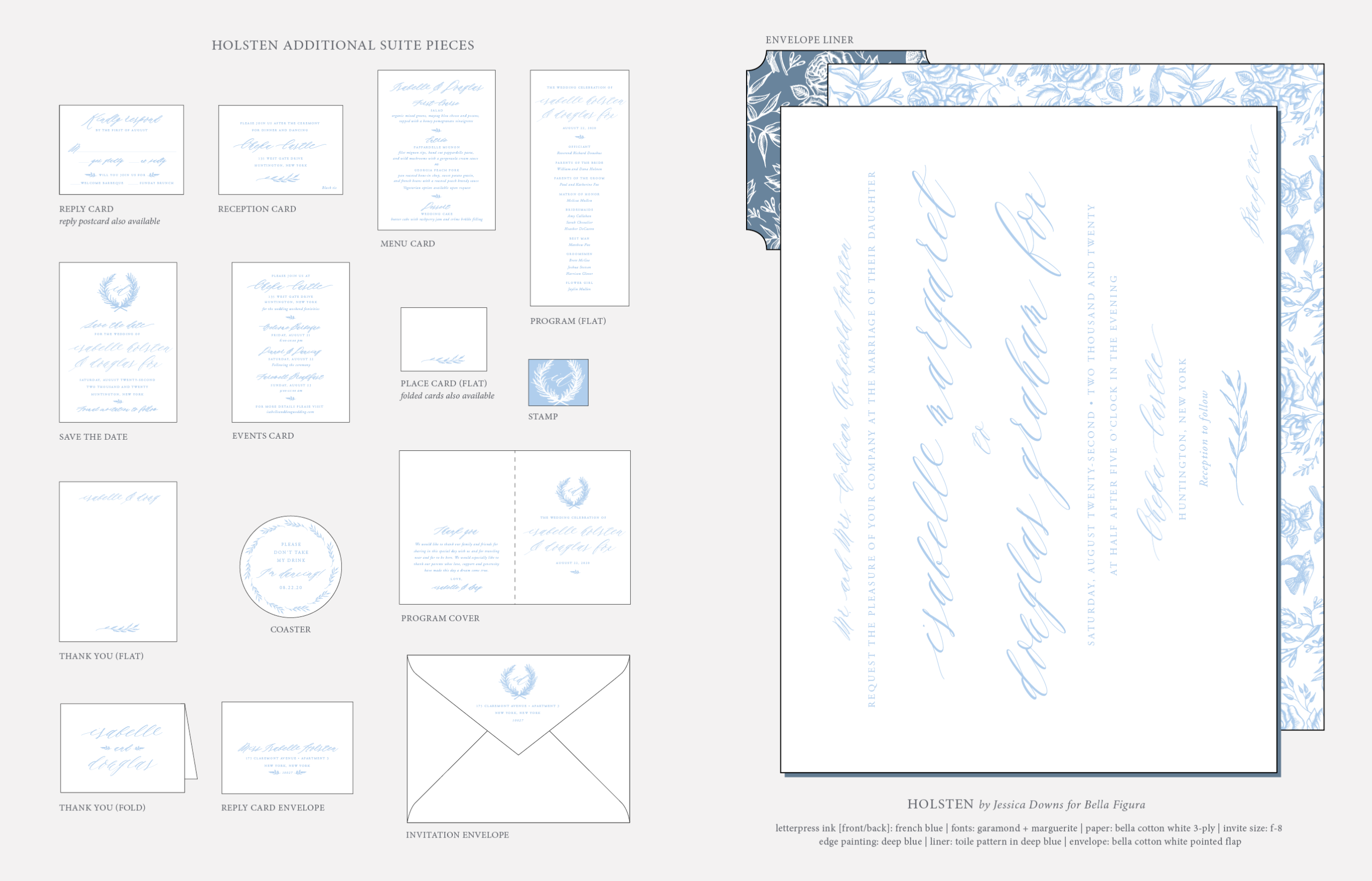 Retired Designs by Jessica Downs for Bella Figuraletterpress ink: french blue| fonts: garamond + marguerite| paper: bella cotton white 3-ply | letterpress backing: toile pattern in french blue | edge painting: deep blue | invite size: f-8| envelope liner: toile pattern in deep blue | envelope: bella cotton white pointed flap