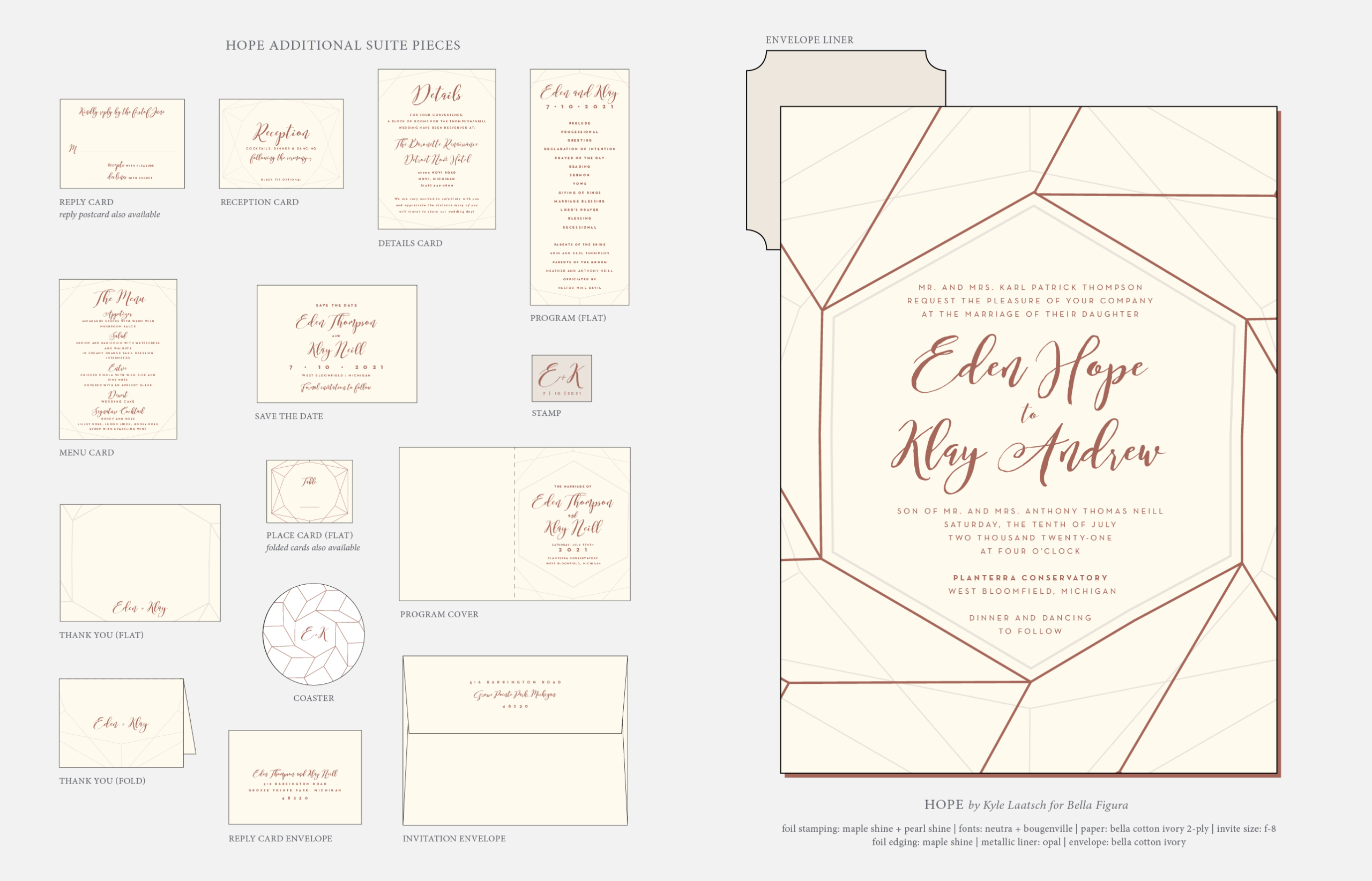 Retired Designs by Kyle Laatsch for Bella Figurafoil stamping: maple shine + pearl shine | fonts: neutra + bougenville | paper: bella cotton ivory 2-ply | foil edging: maple shine | invite size: f-8 | metallic liner: opal | envelope: bella cotton ivory