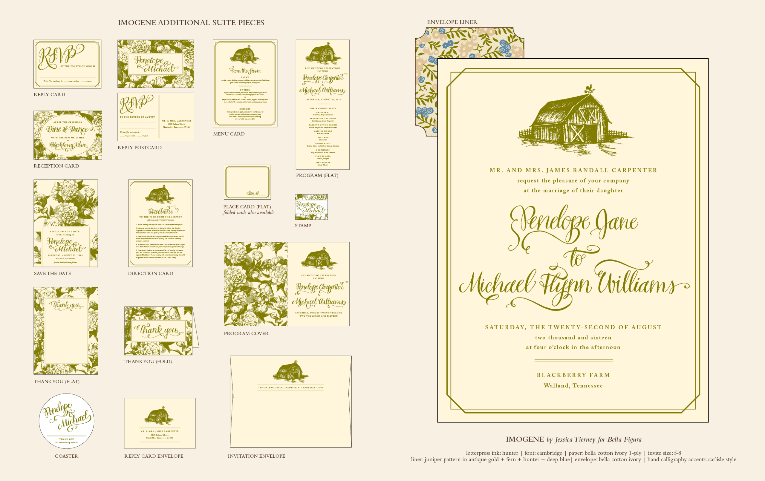 Designer Jessica Tierney envisioned a rustic pastoral wedding with antique details and character-a-plenty for this unique custom letterpress invitation. Perfect for a sweet farmyard wedding or any country shindig held in a barn, Imogene is sure to have your rooster crowing.