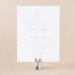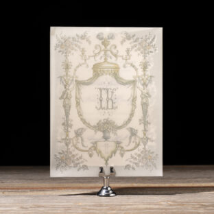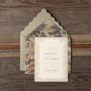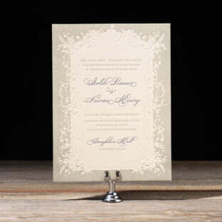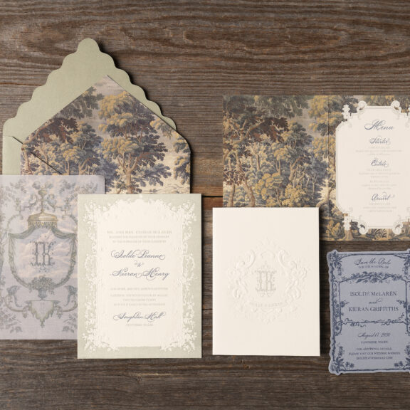 Wedding Invitations by Leslie Johnston for Bella Figuraletterpress ink: mineral + yale | sculpted embossing: blind | digital inks: stone + cmyk | fonts: calserif regular + diplomatic script | paper: bella cotton ivory 2-ply + 40# vellum (overlay) | invitation size: f-8 for inner envelope (tier 3) | custom converted inner envelope: bella cotton ivory text | inner envelope printing: isolde pattern in cmyk (interior/exterior) | custom converted outer envelope: spruce text | diecut style: e-416 | digital addressing: yale