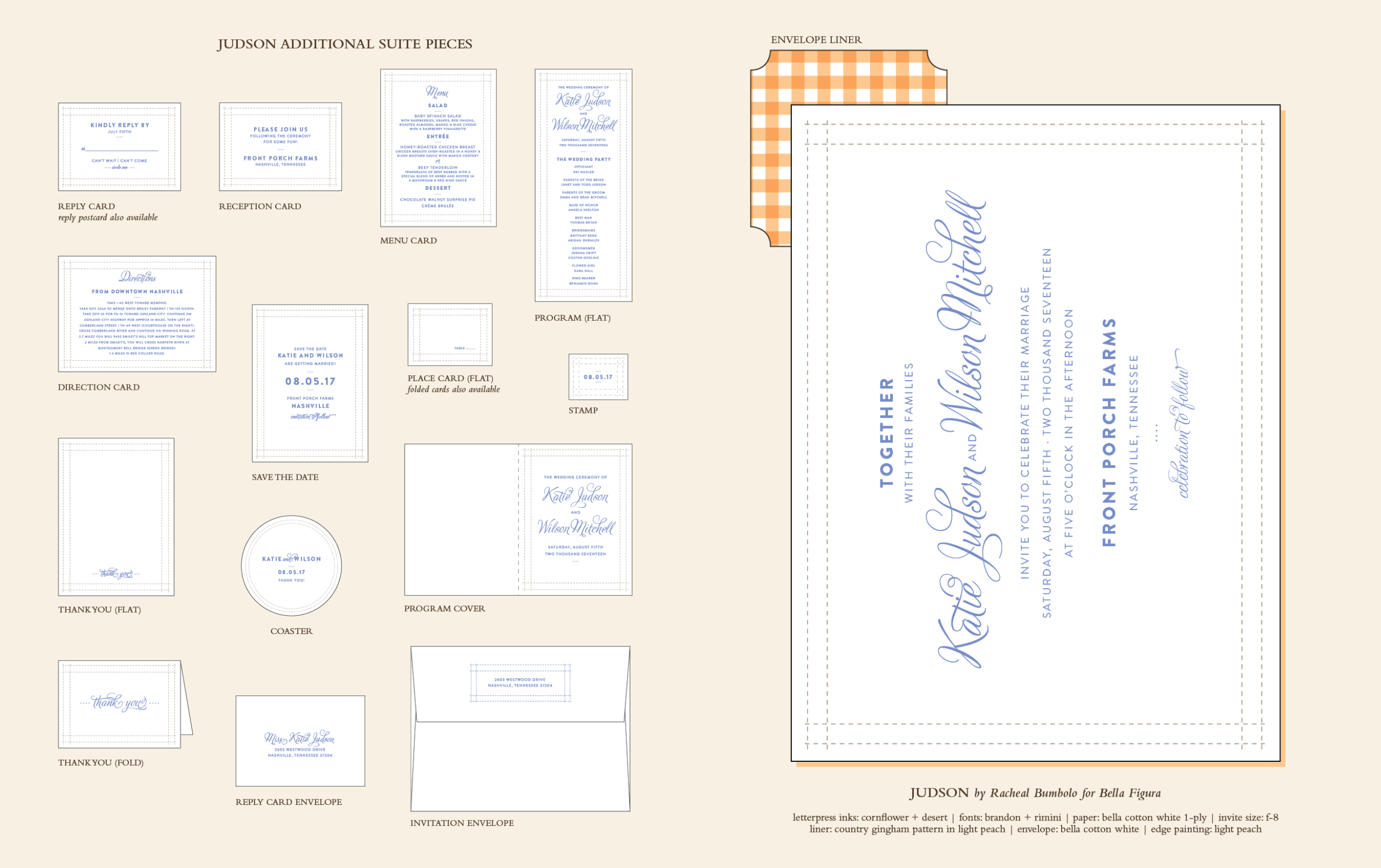 by Racheal Bumbolo for Bella FiguraThis fresh design from Racheal Bumbolo is letterpress printed using classic antique presses and shines with lovely, hand-stitched style. Perfect for an intimate wedding with romantic decor, these letterpress wedding invitations are classic and refined.