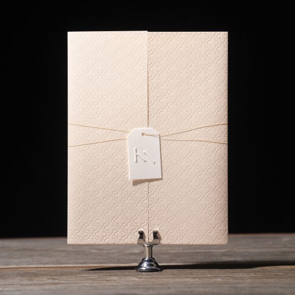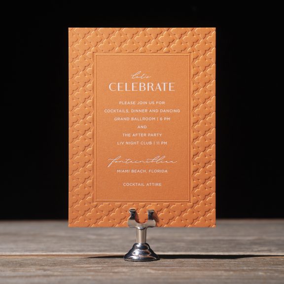 foil stamping: white matte | embossing: blind | fonts: ravensara sans + gotham + karmila script | paper: metallic flame 2-ply | card size: a-6 (tier 2)