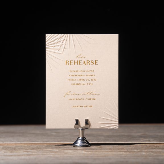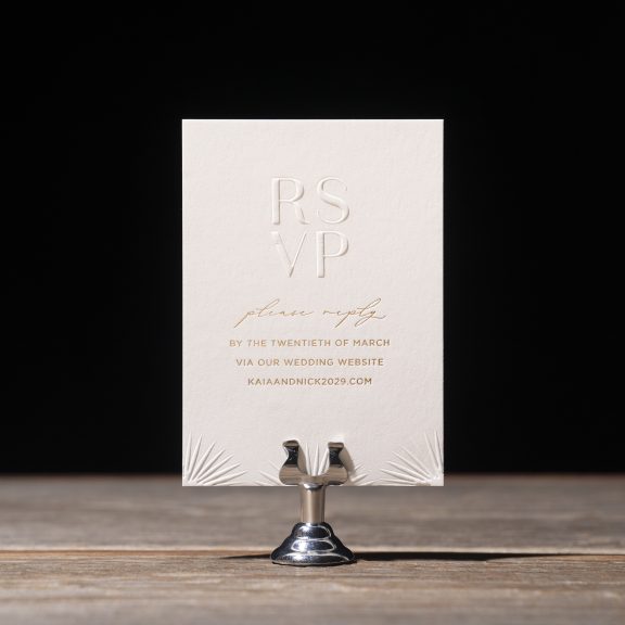 foil stamping: gold matte | embossing: blind | fonts: ravensara sans + gotham + karmila script | paper: bella smooth white 1-ply | card size: a-5 (tier 1)