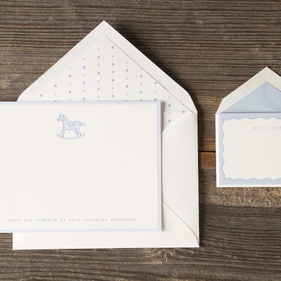 Social Stationery by Lindsy Talarico for Bella Figuraletterpress inks: carolina + french blue | fonts: karin | paper: bella smooth cotton white 1-ply | card size: a-6 (tier 2) | liner: little star pattern in carolina + french blue | envelope: bella cotton white pointed flap | digital addressing inks: carolina + french blue