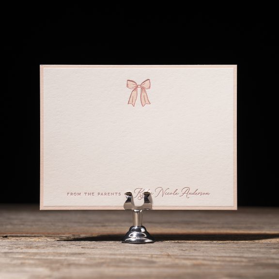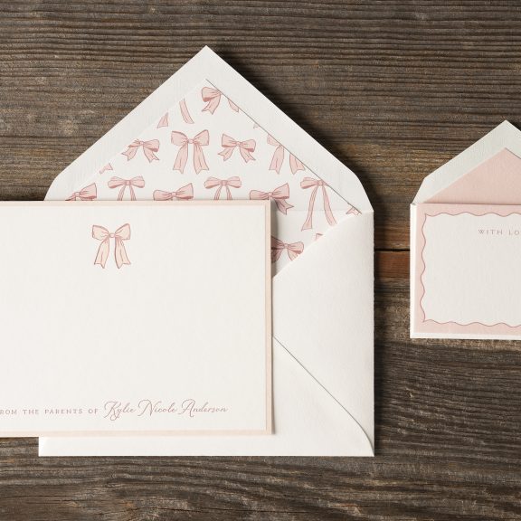 Social Stationery by Lindsy Talarico for Bella Figuraletterpress inks: rouge + whisper | fonts: karin + parisian | paper: bella smooth cotton white 1-ply | card size: a-6 (tier 2) | liner: bows pattern in rouge + whisper | envelope: bella cotton white pointed flap | digital addressing inks: rouge + whisper