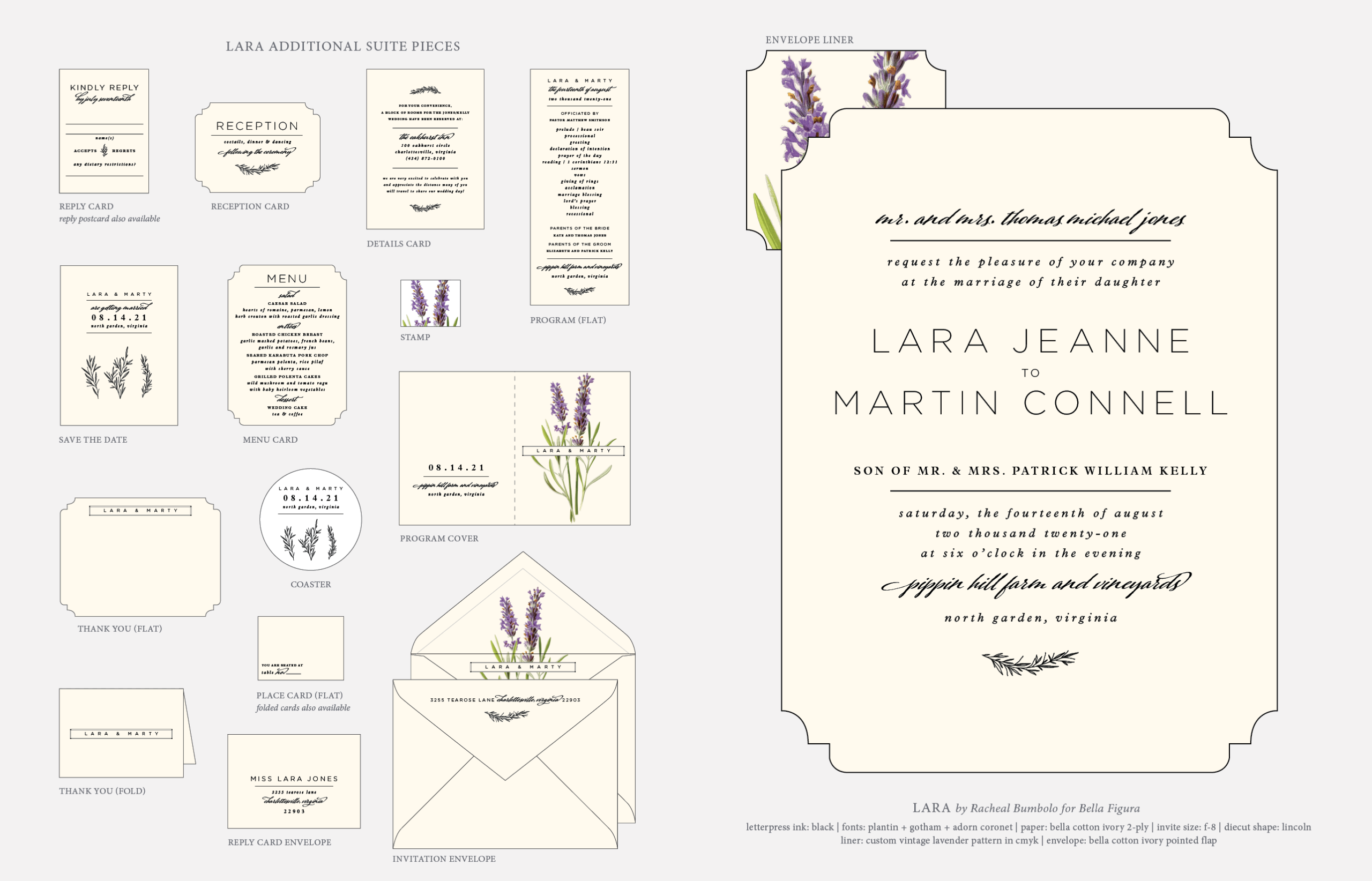 Retired Designs by Racheal Bumbolo for Bella Figuraletterpress ink: black | fonts: plantin + gotham + adorn coronet | paper: bella cotton ivory 2-ply | invite size: f-8 | diecut shape: lincoln | liner: custom vintage lavender pattern in cmyk | envelope: bella cotton ivory pointed flap