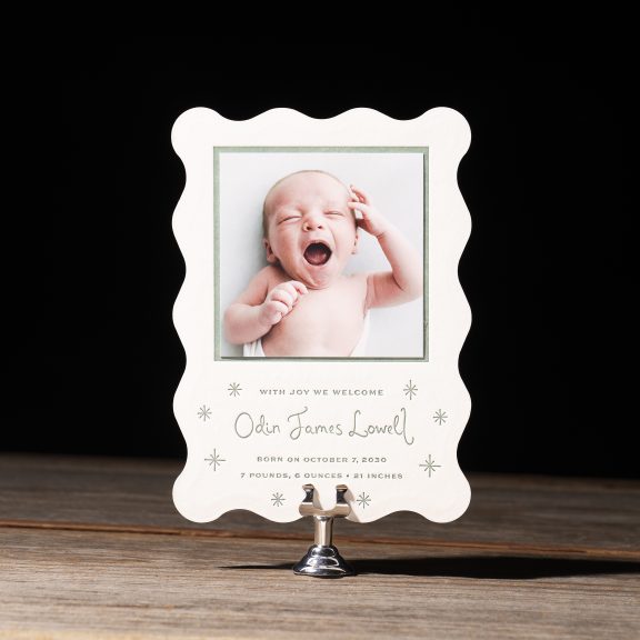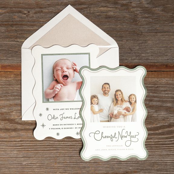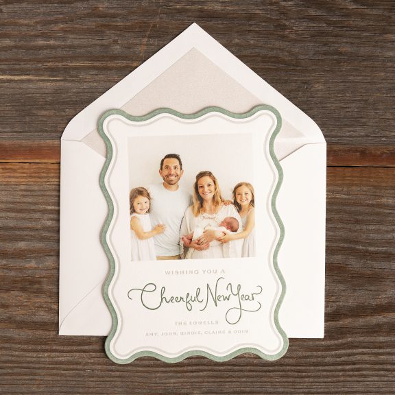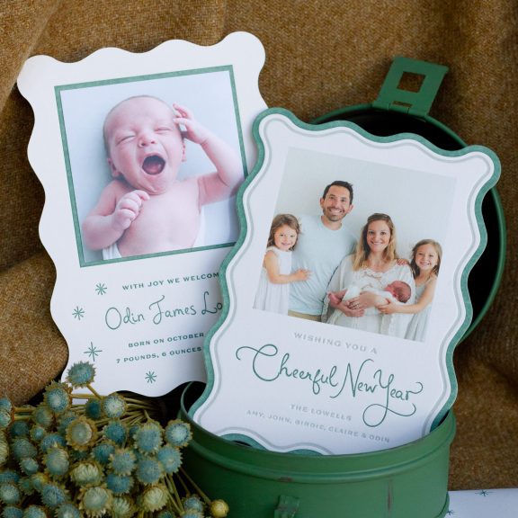 Holiday Cards by Jessica Downs for Bella Figuraletterpress inks: mineral (front) + verdigris (front + back) | digital ink: cmyk | fonts: sweet gothic + gerald & margaret | paper: bella smooth cotton white duplexed 2-ply | card size: a-7 (tier 3) | diecut style: cd-591 | mounted photo print: 3.5 x 3.5 matte | liner: metallic oyster text | envelope: bella cotton white pointed flap | digital addressing ink: verdigris