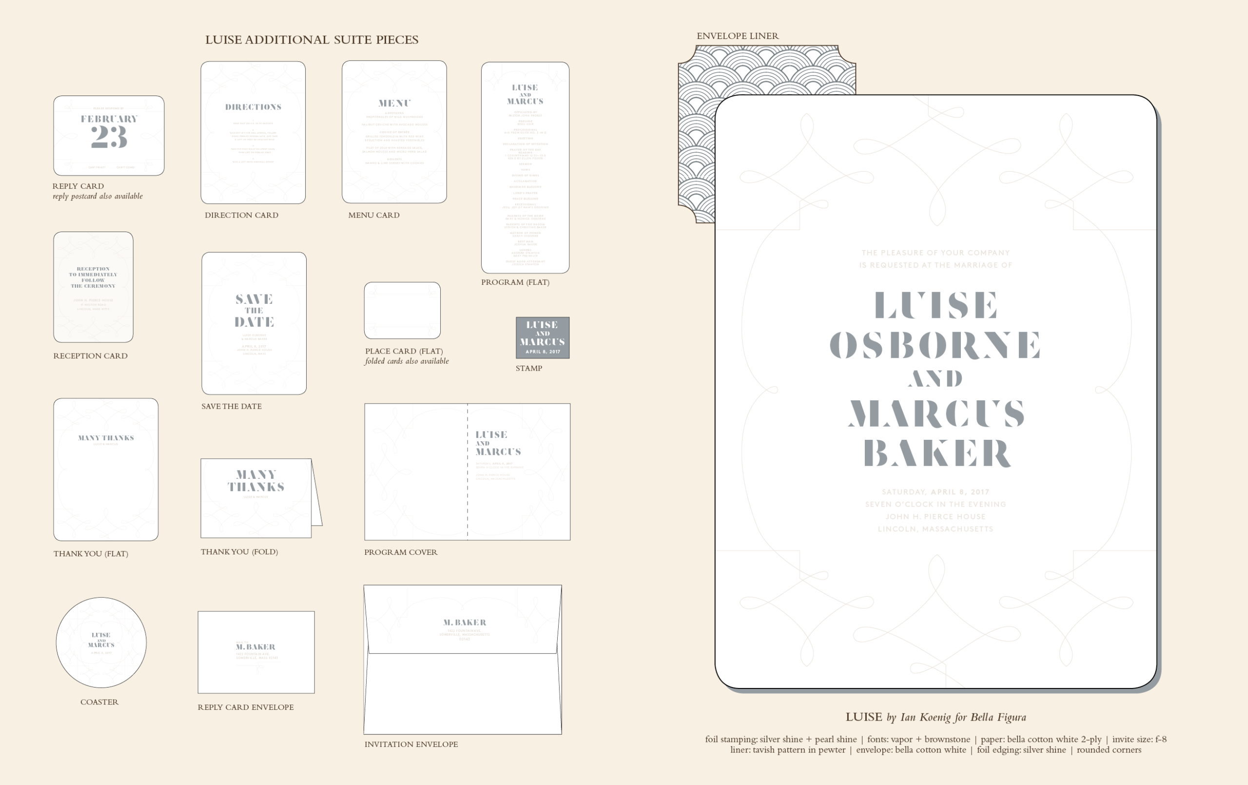 Wedding Invitations by Ian Koenig for Bella FiguraLuise from Ian Koenig is a modern wedding invitation with framed, simple threads of foil-stamped magic throughout. Perfect for a sleek, urban wedding in a dazzling art gallery venue, these letterpress wedding invitations are contemporary and posh.