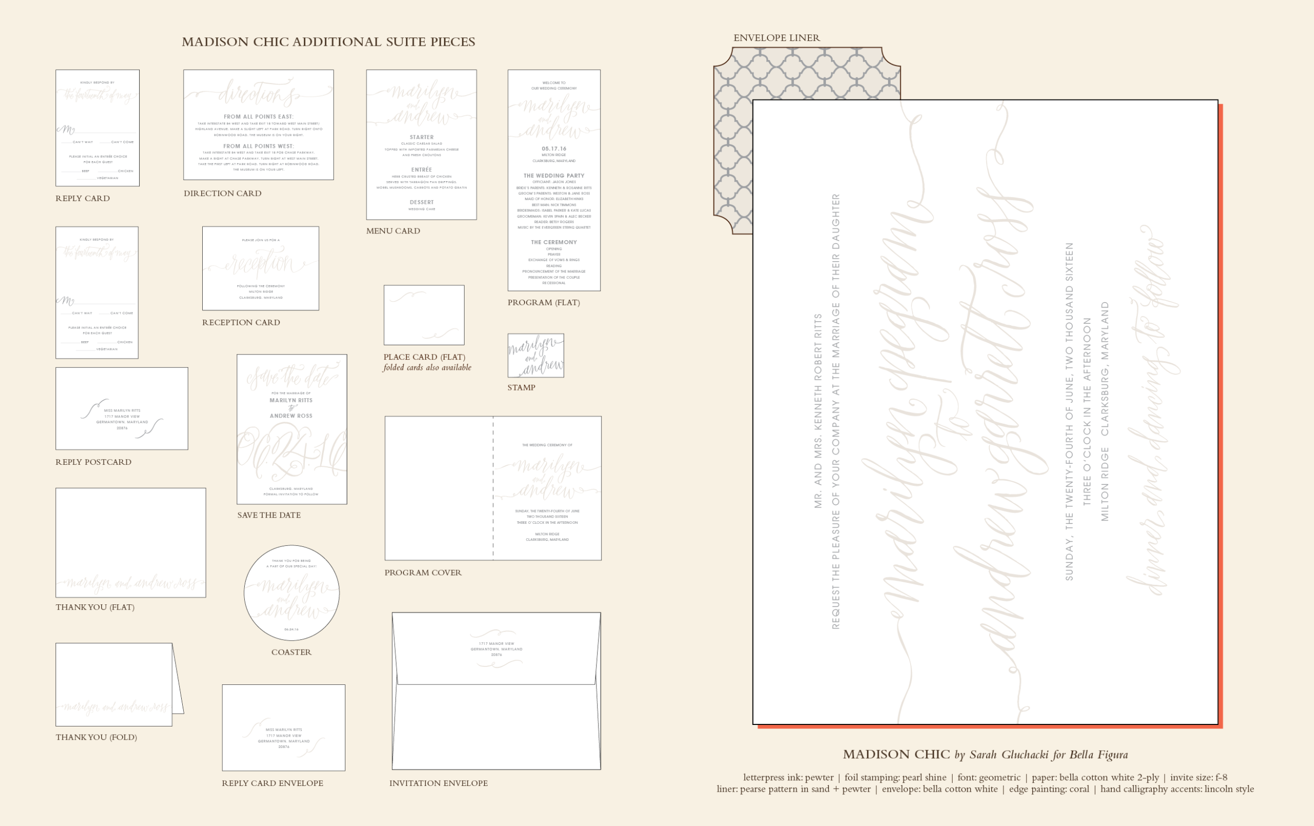 by Sarah Gluchacki for Bella FiguraMadison Chic is a celebration of funky yet delicate calligraphy style from designer Sarah Gluchacki. These modern wedding invitations are hand penned by Elizabeth Hardin with soft, unique letters perfect for a contemporary city wedding with indie shine.