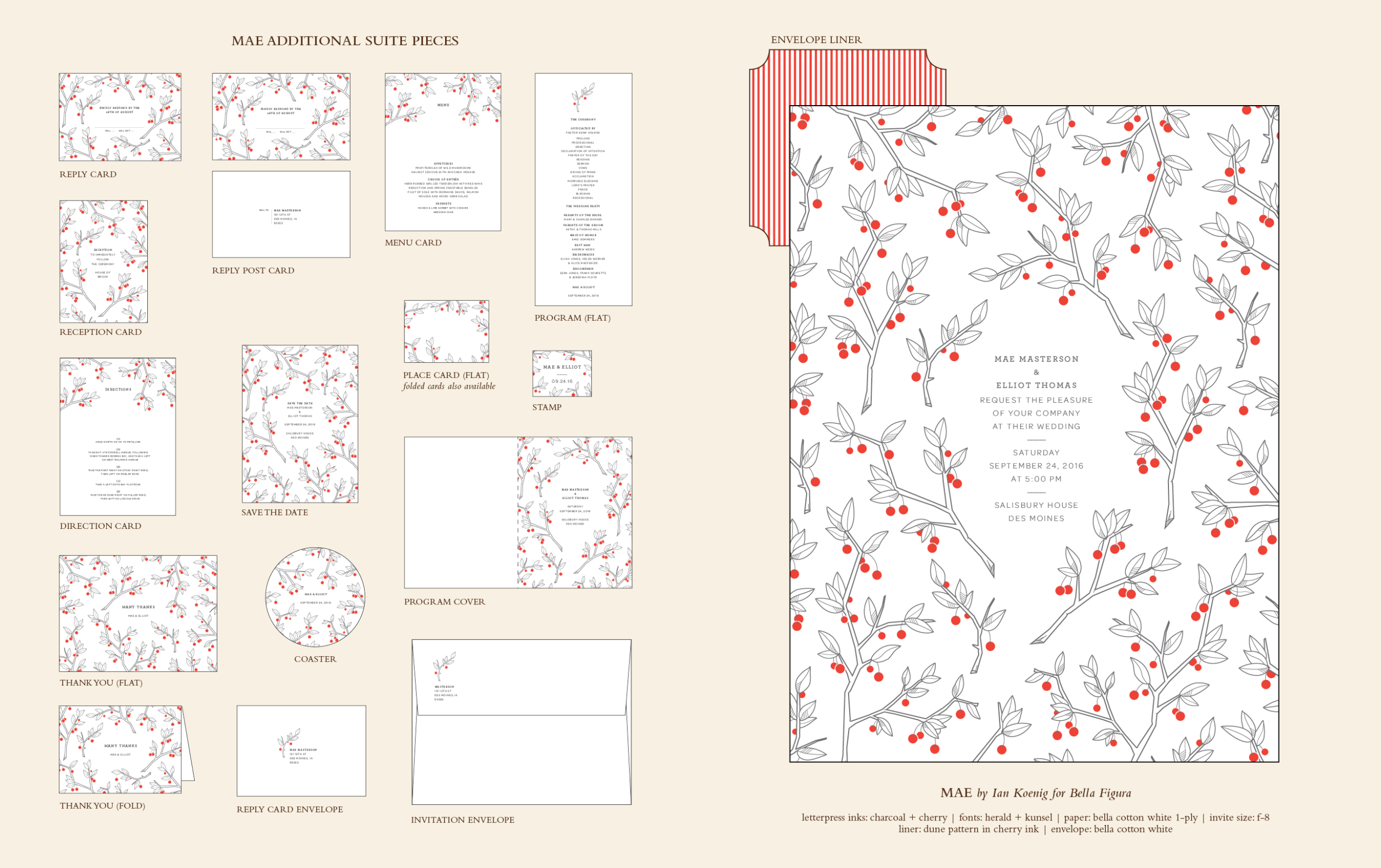 by Ian Koenig for Bella FiguraSweet and pretty with a contemporary edge, Mae letterpress wedding invitations are a fresh sentiment from Ian Koenig. Simple style and cascades of descending cherry branches make these wedding invitations the perfect complement for both modern and traditional wedding celebrations.