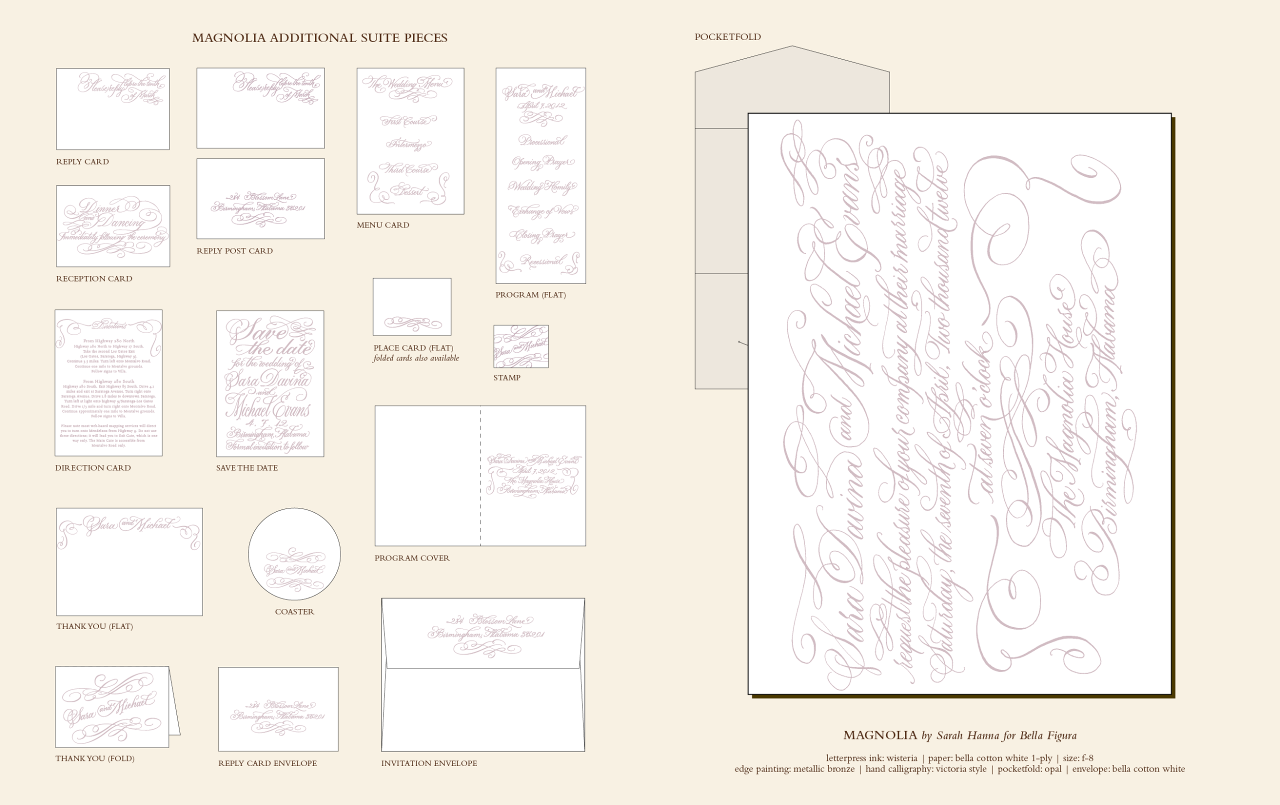 Wedding Invitations by Sarah Hanna for Bella FiguraMagnolia by Sarah Hanna is soft and ethereal letterpress, scented with over the top romance and elegance. Ornate calligraphy takes center stage with these letterpress wedding invitations, which are nothing shy of perfection for an elegant, formal wedding with tastes of romance and glamor.
