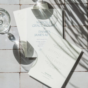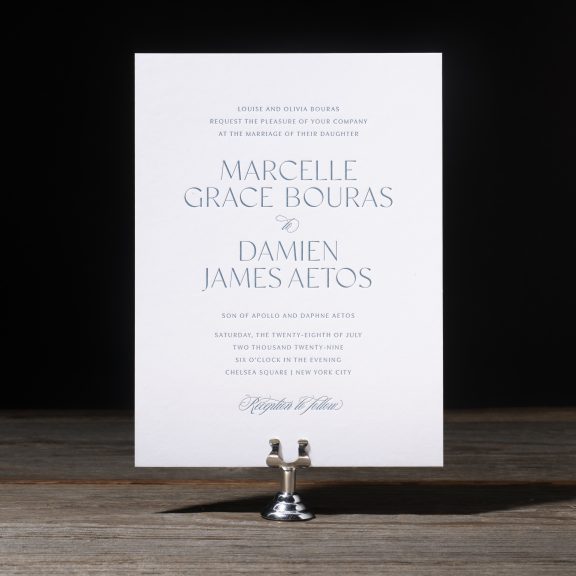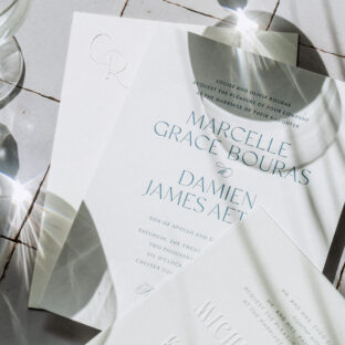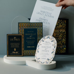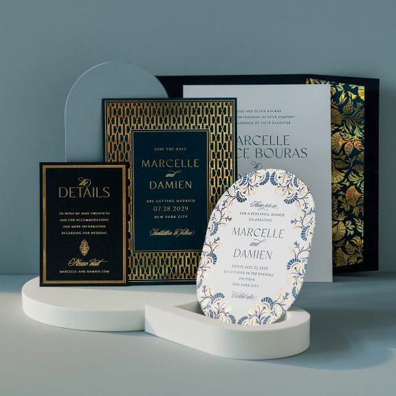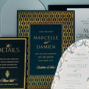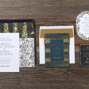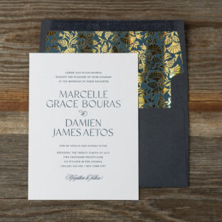 Wedding Invitations by Jessica Downs for Bella Figuraletterpress inks: amazon (front + back) + navy (back) | foil stamping: gold prism shine (back + envelope) | fonts: utile display + classico + angeline | paper: bella smooth cotton bright white 2-ply | invite size: f-8 (tier 3) | liner: marcelle pattern in gold prism shine on amazon text | envelope: dark blue | digital addressing ink: white