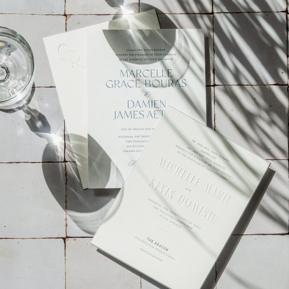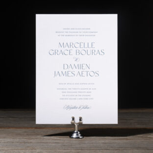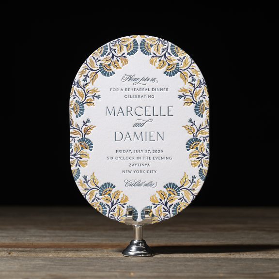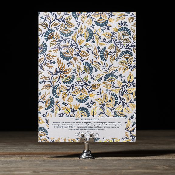 letterpress inks: amazon + navy | foil stamping: gold prism shine | fonts: utile display + classico + angeline | paper: bella smooth cotton bright white 2-ply | card size: a-6 (tier 2) | diecut style: bf-113