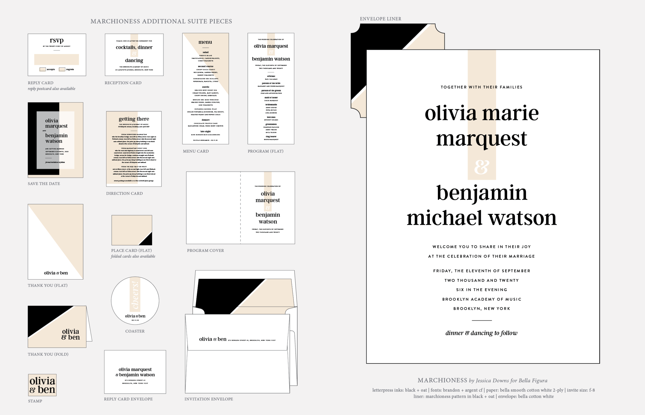 Retired Designs by Jessica Downs for Bella Figuraletterpress inks: black + oat | fonts: brandon + argent cf | paper: bella smooth cotton white 2-ply | invite size: f-8 | liner: marchioness pattern in black + oat envelope: bella cotton white