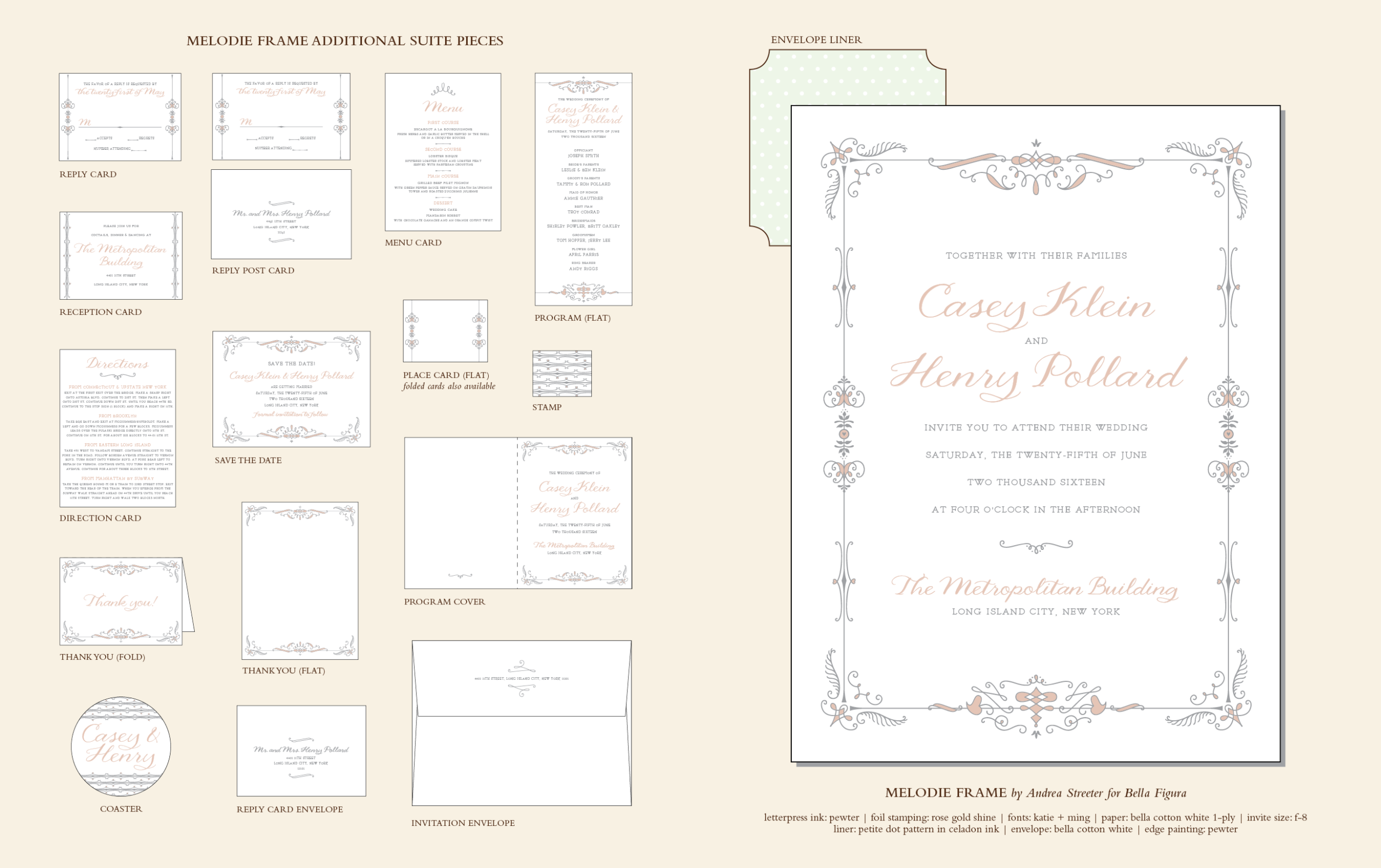 Wedding Invitations by Andrea Streeter for Bella FiguraCreated by Andrea Streeter and letterpressed on our antique presses in upstate New York, these breathtaking wedding invitations are romantic, refined, and have an updated sense of European heritage. With it's modern reworking of traditionally inspired letterpress ornaments, Melodie Frame wedding invitations are something of a beautiful contradiction - both vintage and perfectly contemporary.
