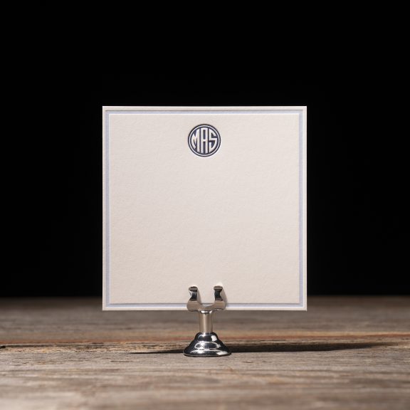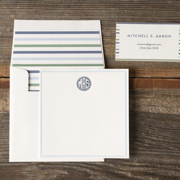 Social Stationery by Lindsy Talarico for Bella Figuraletterpress inks: yale + french blue | fonts: lhf monogram circle + brandon | paper: bella smooth cotton white 1-ply | card size: sq-5 (tier 1) | liner: mitchell stripes in yale + french blue + verdegris | envelope: bella cotton white | digital addressing ink: yale