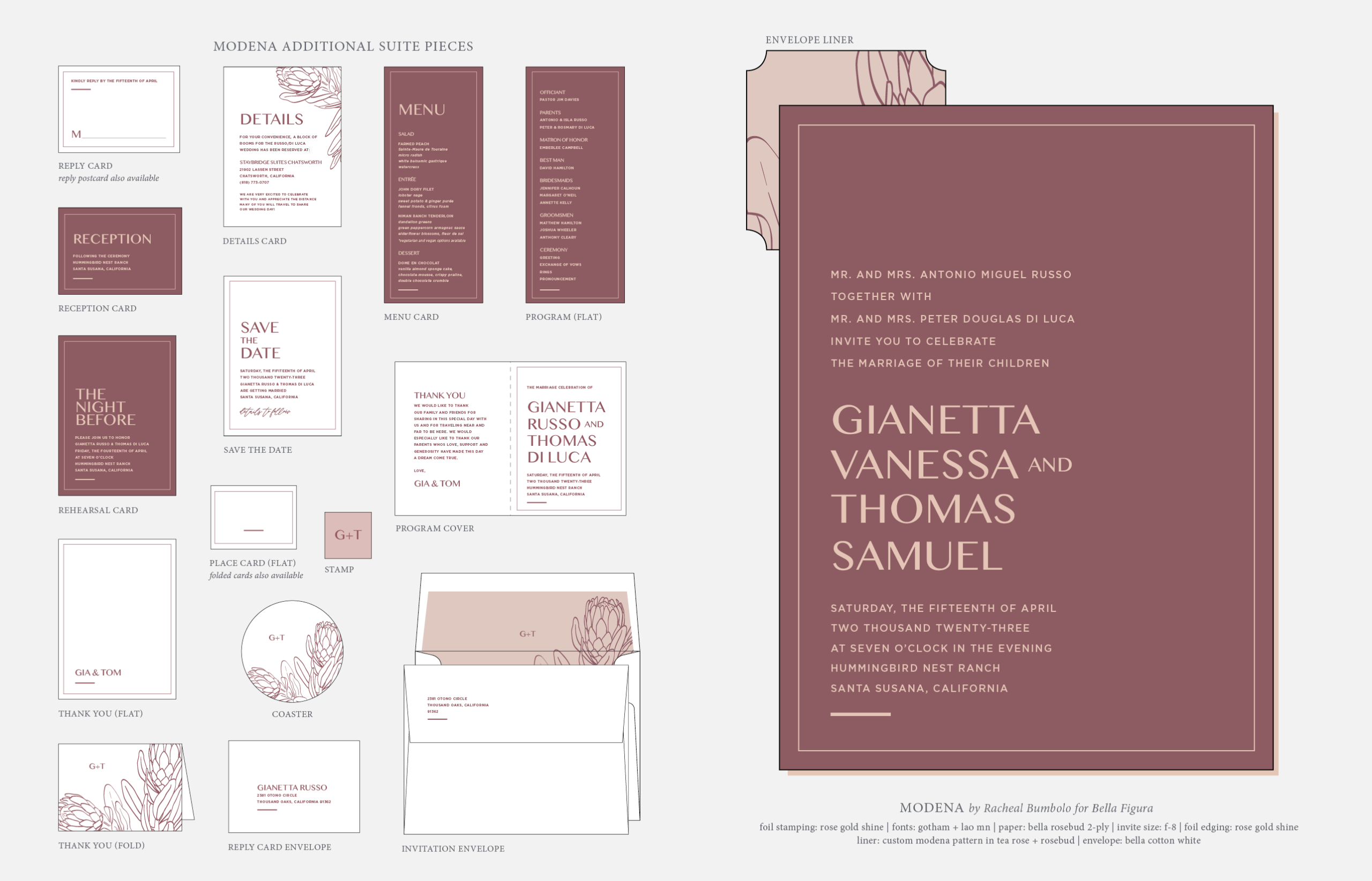 Save the Dates by Racheal Bumbolo for Bella Figuraletterpress ink: rosebud | fonts: gotham + lao mn | paper: bella smooth cotton 2-ply | size: a-6 | foil edging: rose gold shine