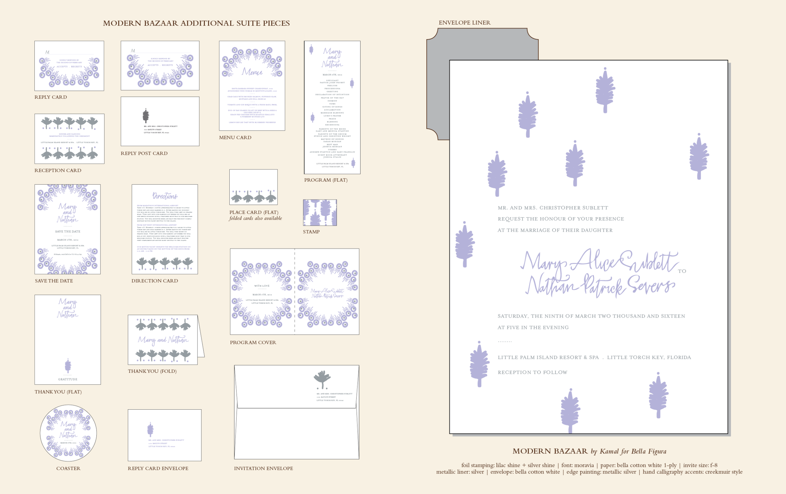 Uniquely inspired by traditional Indian block printing, Modern Bazaar from designer Kamal features a brilliantly modern sensibility. When wedding plans call for a fusion of natural abstraction and posh contemporary design, these elegant letterpress invitations are the perfect choice.