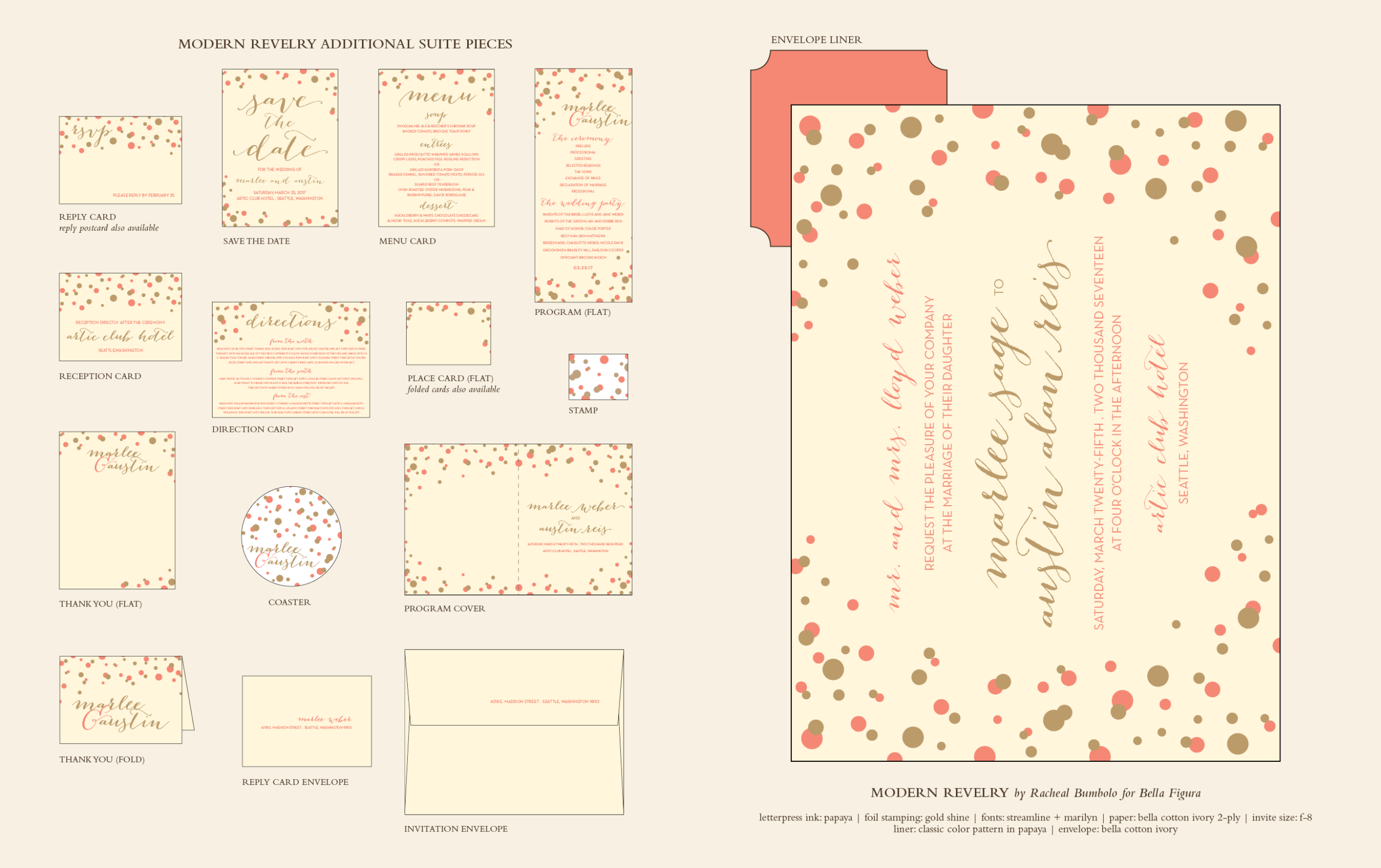 Graphic retro wedding style comes to life with Modern Revelry, a simple and modern letterpress wedding invitation from Racheal Bumbolo. With funky colors and contemporary lines, these wedding invitations are the letterpress cool your wedding is dreaming of.