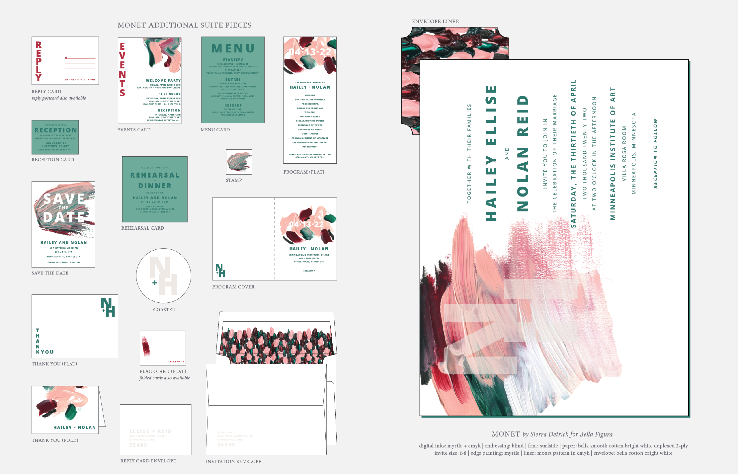 Retired Designs by Sierra Detrick for Bella Figuradigital inks: myrtle + cmyk | embossing: blind | font: surfside | paper: bella smooth cotton bright white duplexed 2-ply | invite size: f-8 | edge painting: myrtle | liner: monet pattern in cmyk | envelope: bella cotton bright white