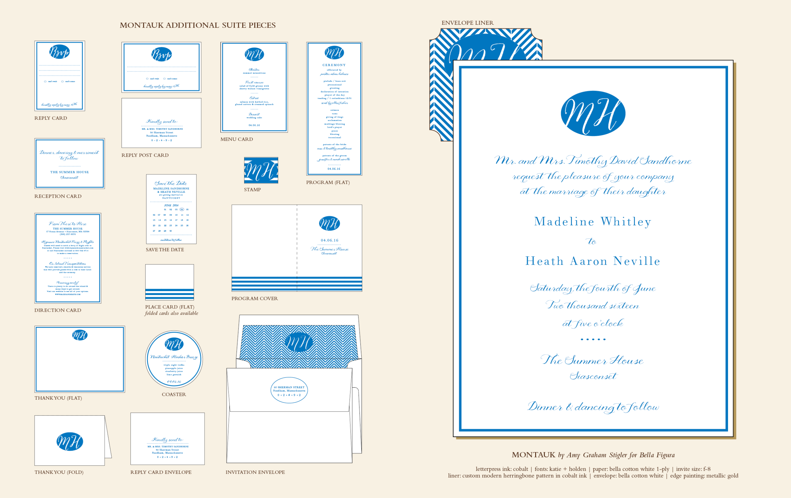 by Amy Graham Stigler for Bella FiguraAmy Graham Stigler's elegant Montauk invitation is beach-ready and flickers wildly with letterpress romance. Take a bicycle ride out to the lighthouse with the ocean breeze in your hair and fresh blooms in your basket - Montauk letterpress wedding invitations are sweetly sophisticated and steeped in classic island refinement.