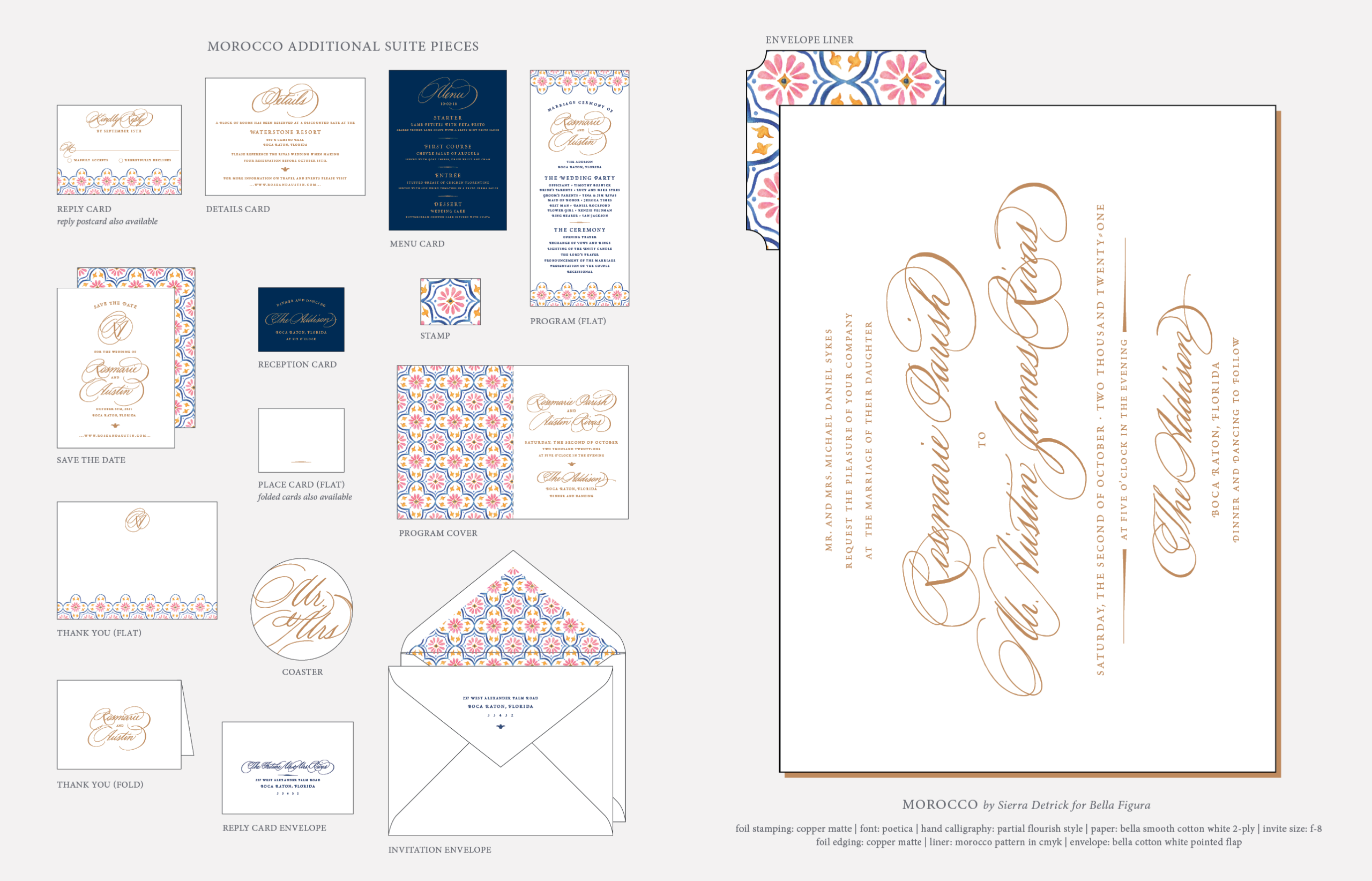 Retired Designs by Sierra Detrick for Bella Figurafoil stamping: copper matte | font: poetica | hand calligraphy: this style is no longer available | foil edging: copper matte | paper: bella smooth cotton white 2-ply | invite size: f-8 | liner: morocco pattern in cmyk | envelope: bella cotton white pointed flap
