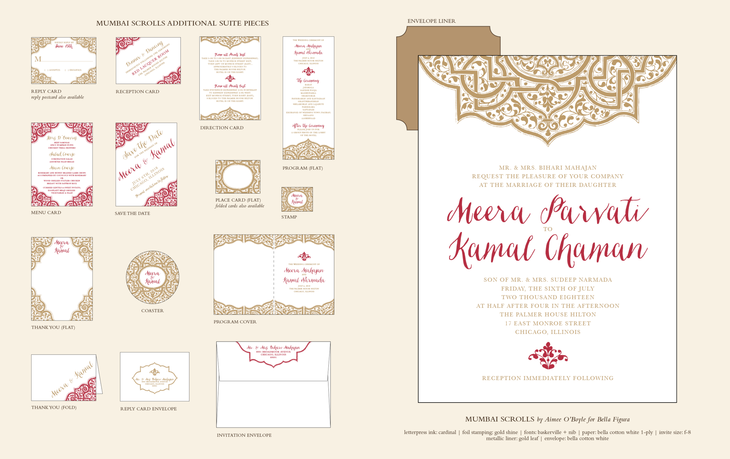 Wedding Invitations by Aimee O'Boyle for Bella FiguraInspired by a traditional East Indian wedding, Mumbai Scrolls is an ornate foil stamped wedding invitation with exotic charm. Letterpress printed in Cardinal ink with Gold Shine foil stamped details, these Indian wedding invitations are printed on our white Bella Cotton paper and paired with a metallic Gold Leaf envelope liner.