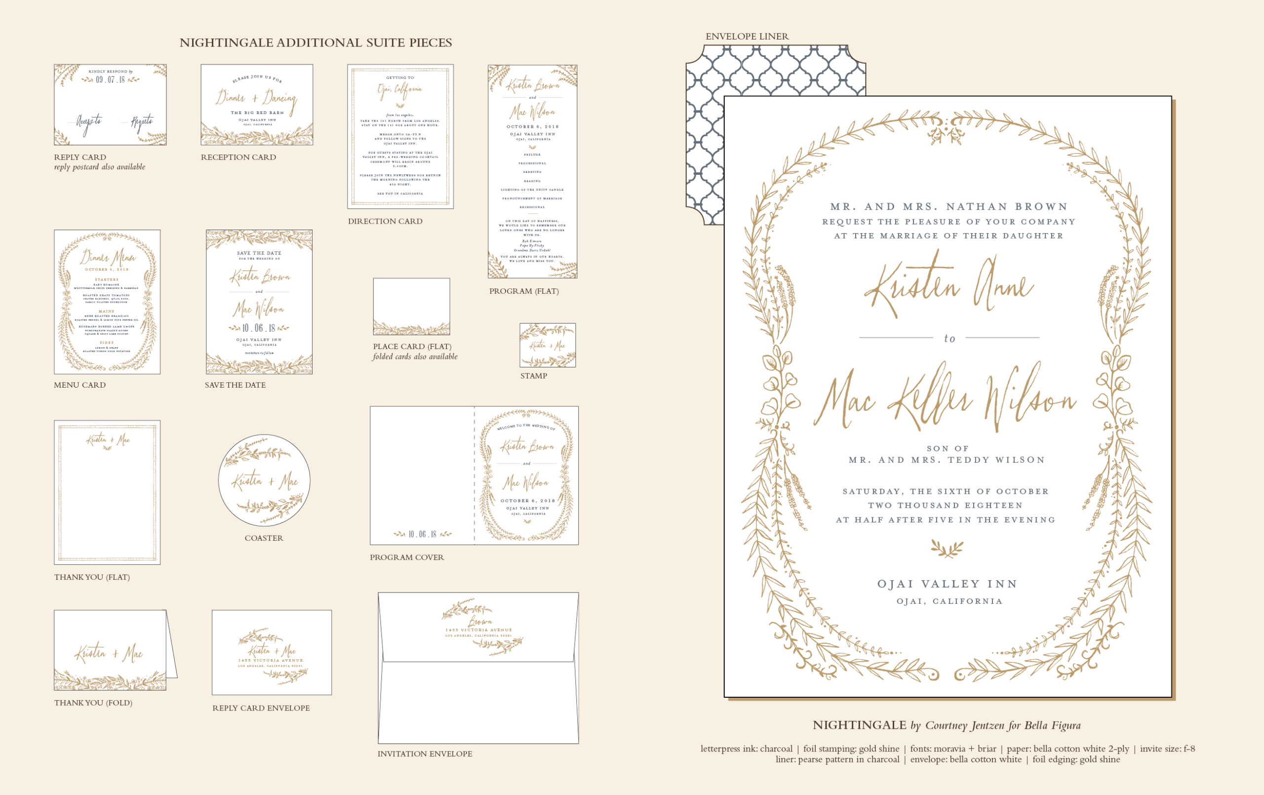 Wedding Invitations by Courtney Jentzen for Bella FiguraHeld on the grounds of a grand estate, Nightingale weddings are fun yet formal. Ideal for a fall wedding overflowing with champagne and twinkle lights, these letterpress wedding invitations by Courtney Jentzen feature a classy color pairing of Gold Shine foil stamping with Charcoal letterpress ink.