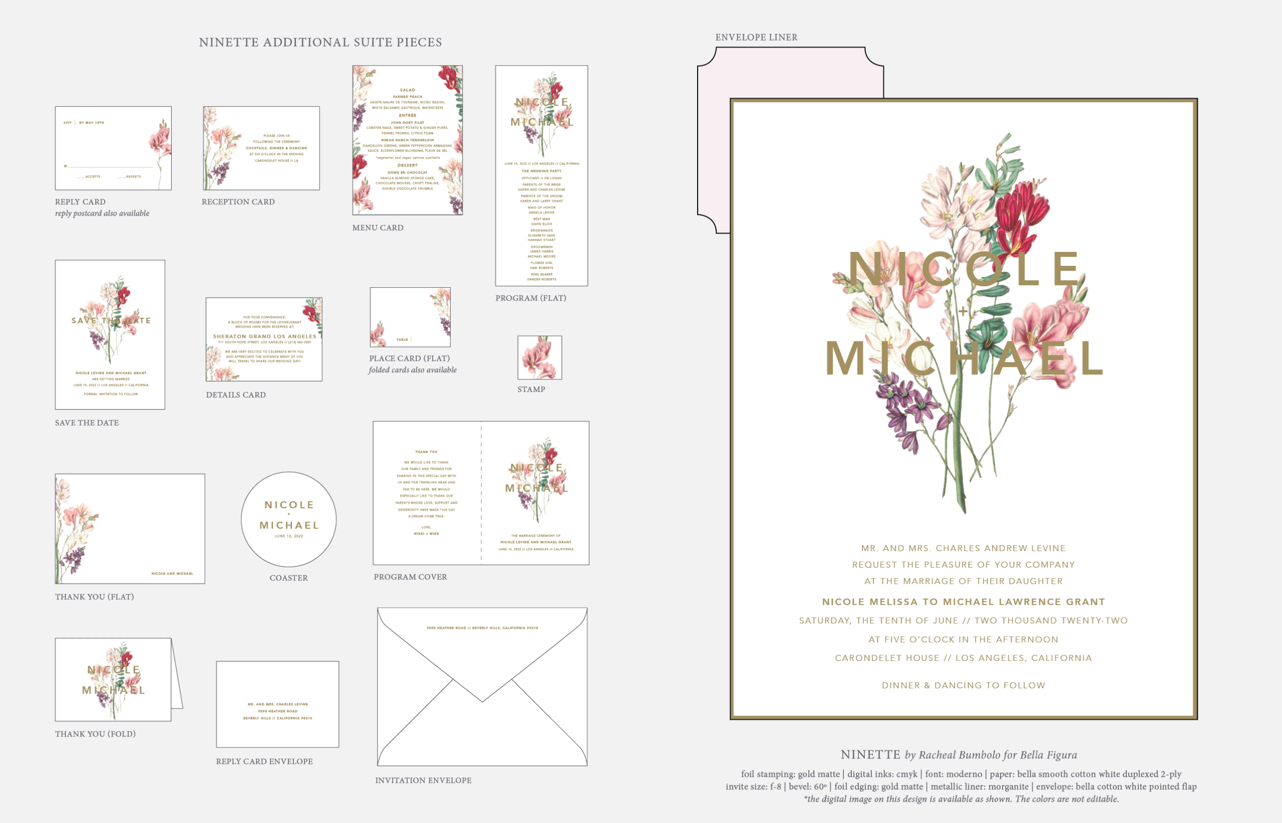 Retired Designs by Racheal Bumbolo for Bella Figurafoil stamping: gold matte | digital inks: cmyk | font: moderno | paper: bella smooth cotton white duplexed 2-ply | invite size: f-8 | bevel: 60ยบ | foil edging: gold matte | metallic liner: morganite | envelope: bella cotton white pointed flap