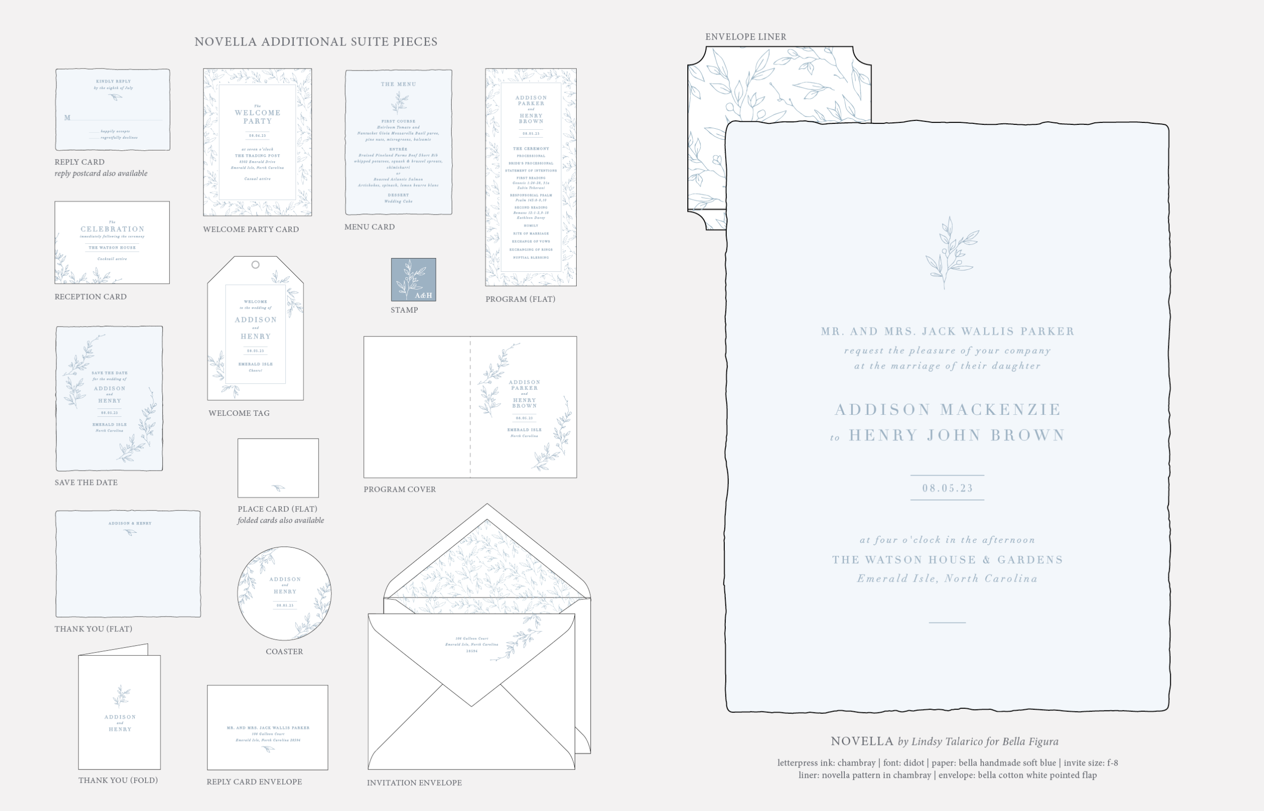 Retired Designs by Lindsy Talarico for Bella Figuraletterpress ink: chambray | font: didot | paper: bella handmade soft blue | invite size: f-8 | liner: novella pattern in chambray | envelope: bella cotton white pointed flap