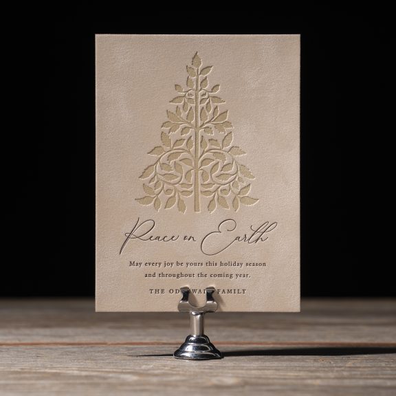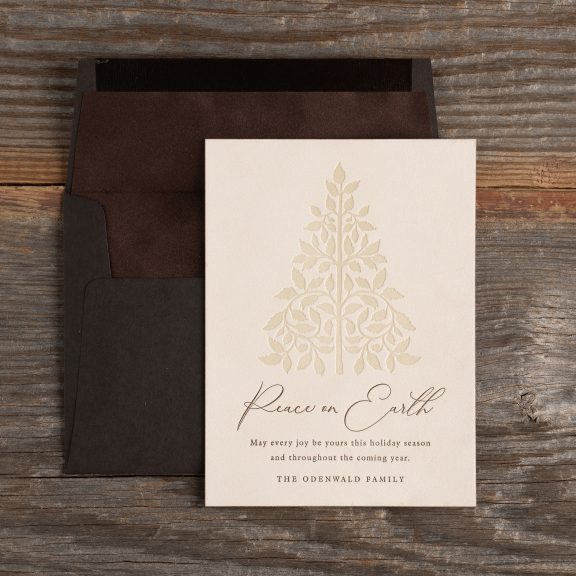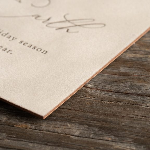 Holiday Cards by Jessica Downs for Bella Figuraletterpress inks: espresso + khaki | fonts: boheme floral + itc galliard pro | paper: linen velvet + almond duplexed 2-ply | card size: a-6 (tier 2) | edge painting: metallic copper | liner: cocoa velvet | envelope: walnut | digital addressing ink: white