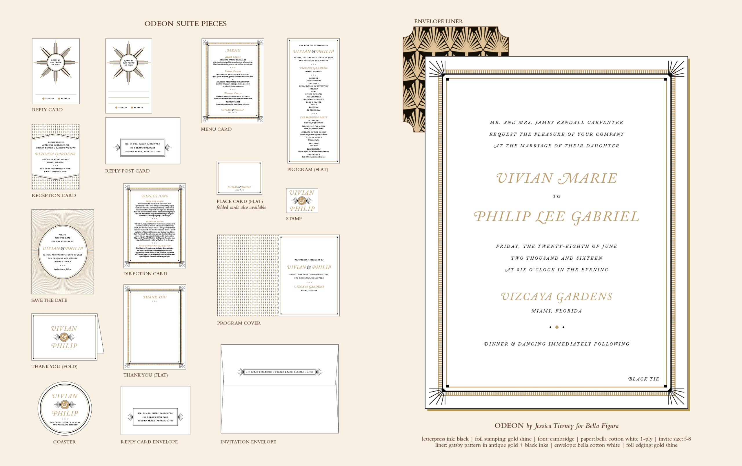 Retired Designs by Jessica Downs for Bella Figuraletterpress ink: black | foil stamping: gold shine | font: cambridge paper: bella cotton white 1-ply | invite size: f-8 | liner: gatsby pattern in antique gold + black inks