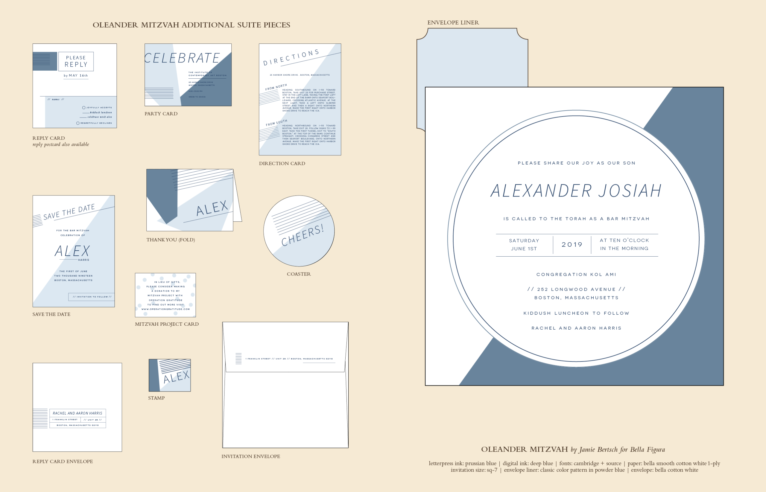 Mitzvah Invitations by Jamie Lea Bertsch for Bella Figuraletterpress ink: prussian blue | digital ink: deep blue | fonts: cambridge + source | paper: bella smooth cotton white 1-ply | invite size: sq-7 | envelope liner: classic color pattern in powder blue | envelope: bella cotton white