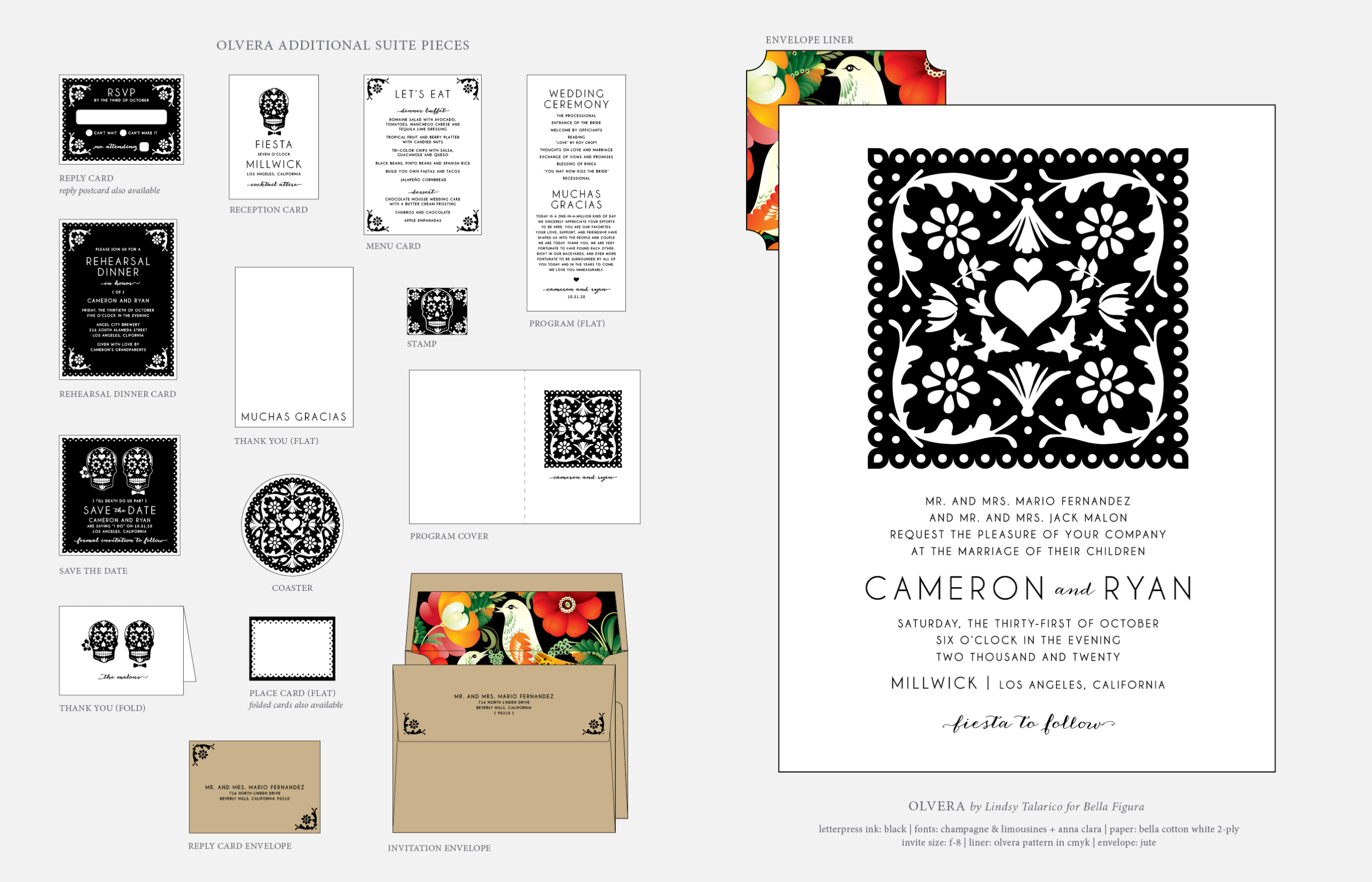 Retired Designs by Lindsy Talarico for Bella Figuraletterpress ink: black | fonts: champagne & limousines + anna clara | paper: bella cotton white 2-ply | invite size: f-8 | liner: olvera pattern in cmyk | envelope: jute