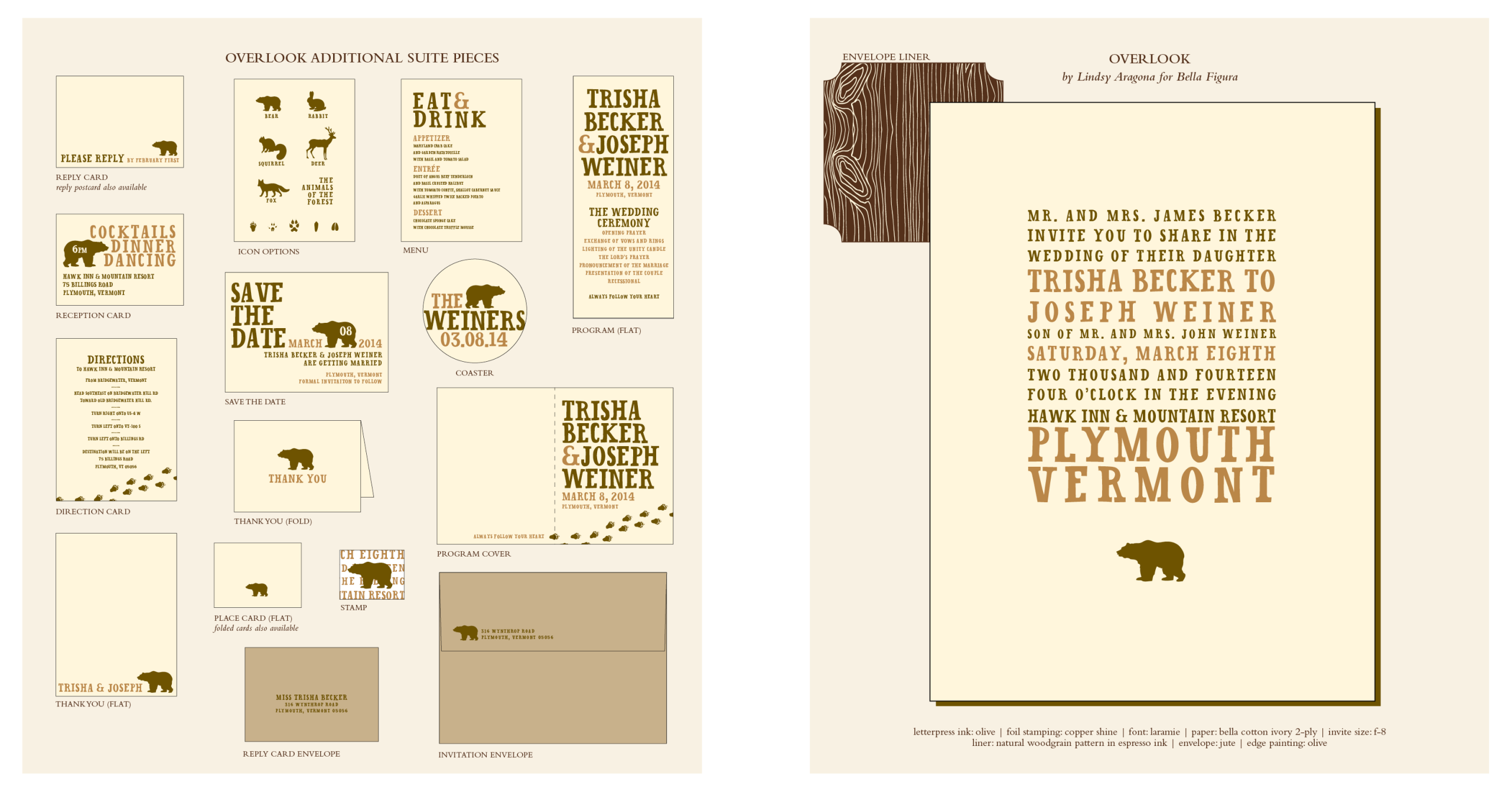 Wedding Invitations by Lindsy Talarico for Bella FiguraA rustic bite of letterpress wedding invitation love, Lindsy Talarico’s Overlook is whimsical, country chic and unbearably cute. Let all your deerly beloved know about the big day in style with these eco letterpress invitations with natural appeal and a selection of alternate animal designs.