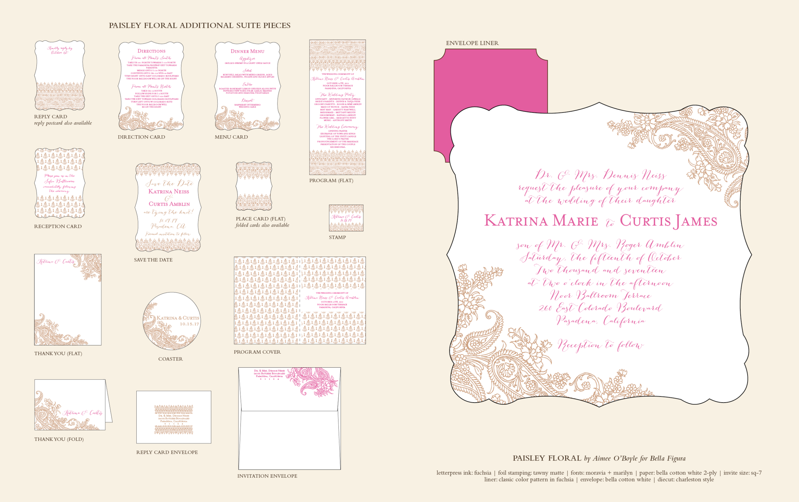 Wedding Invitations by Aimee O'Boyle for Bella FiguraA contemporary statement of worldly bohemian refinement, Paisley Floral letterpress wedding invitations are adventurous souls with a healthy sense of wanderlust. These letterpress invitations from designer Aimee O'Boyle are perfect for far off destination weddings and speak with a romantic air of well-traveled elegance.