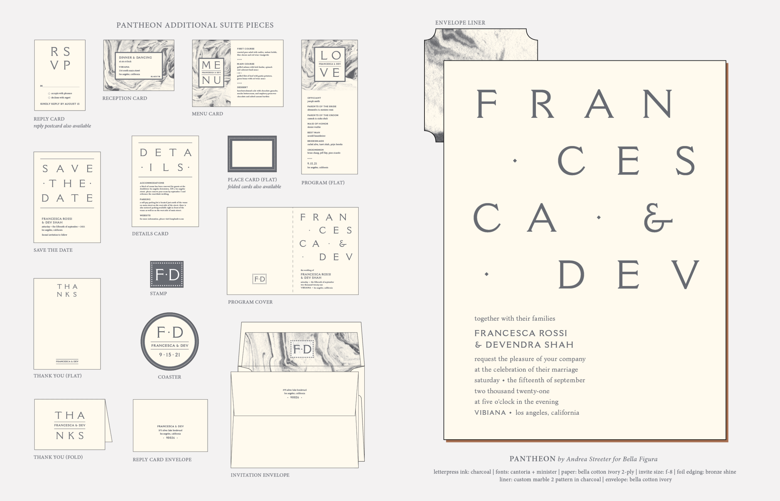 Retired Designs by Andrea Streeter for Bella Figuraletterpress ink: charcoal | fonts: cantoria + minister | paper: bella cotton ivory 2-ply | foil edging: bronze shine | invite size: f-8 | liner: custom marble 2 pattern in charcoal | envelope: bella cotton ivory