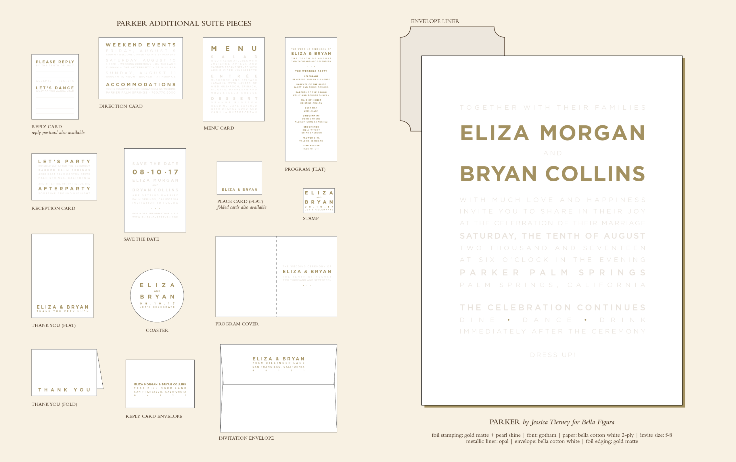 foil stamping: gold matte + pearl shine | font: gotham | paper: bella cotton white 2-ply | invite size: f-8 | metallic liner: opal | envelope: bella cotton white | foil edging: gold matte