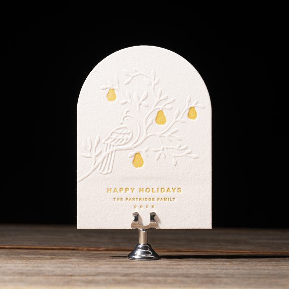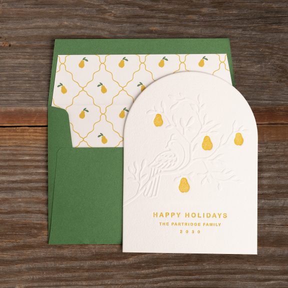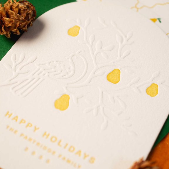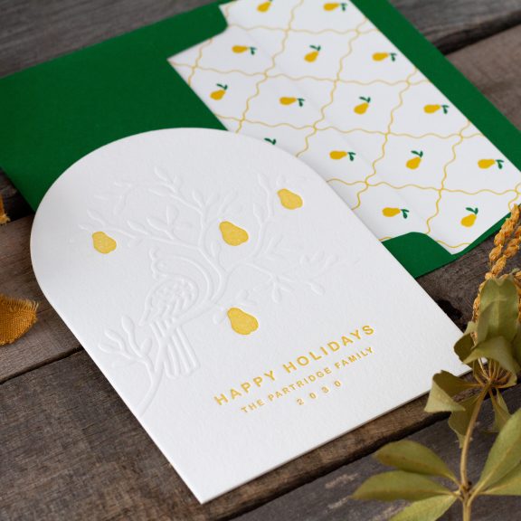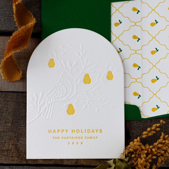 Holiday Cards by Lindsy Talarico for Bella Figuraletterpress ink: goldenrod | embossing: blind | font: arial rounded | paper: bella cotton white 2-ply | card size: a-6 (tier 2) | diecut style: cd-179 | liner: partridge pattern in goldenrod + leaf | custom converted envelope*: leaf | digital addressing ink: white