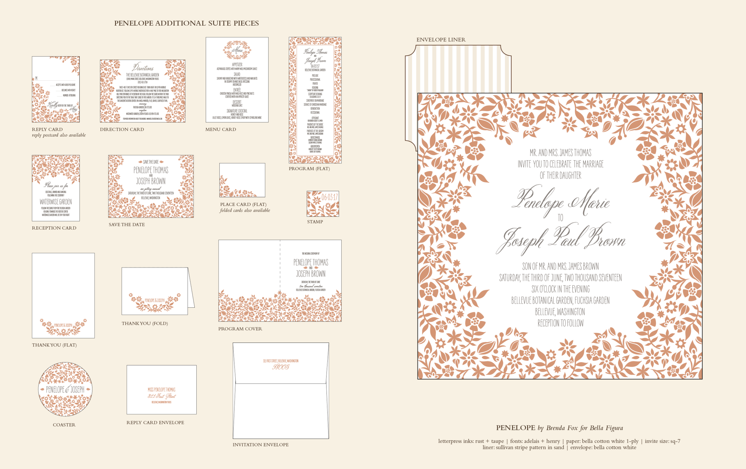 Wedding Invitations by Brenda Fox for Bella FiguraWith cute type and a whimsical floral border, Penelope letterpress wedding invitations are easy to fall for. Brenda Fox’s delicate letterpress design is right at home gracefully sipping French lemonade in a garden of vibrant flowers.