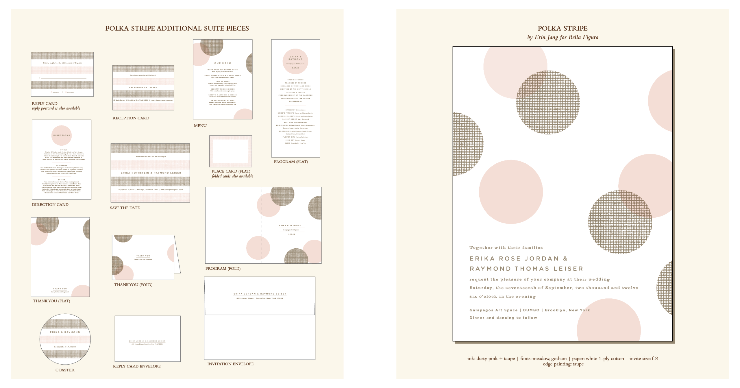 Wedding Invitations by Erin Jang for Bella FiguraPolka Stripe by Erin Jang is simple, modern and unique—a letterpress wedding invitation with a fun, contemporary personality. These wedding invitations feature a bold, graphic pattern with a soft, pretty feel and dazzling letterpress printing.