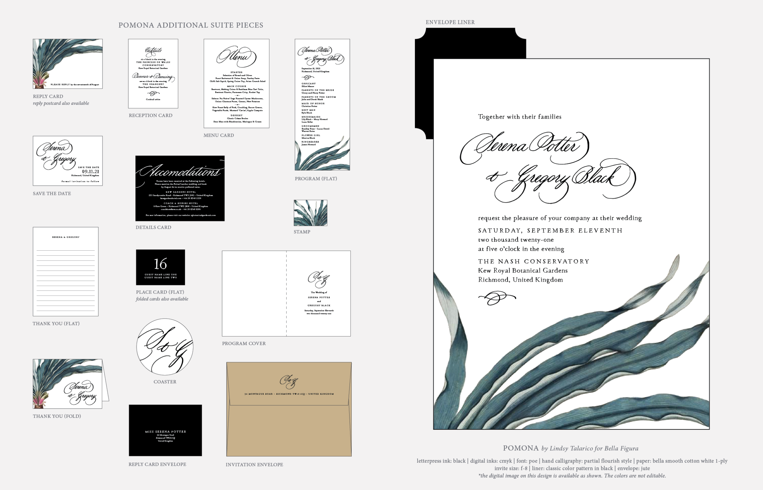 Retired Designs by Lindsy Talarico for Bella Figuraletterpress ink: black | digital ink: cmyk | font: poe | hand calligraphy: this style is no longer available | paper: bella smooth cotton white 1-ply | invite size: f-8 | liner: classic color pattern in black | envelope: jute
