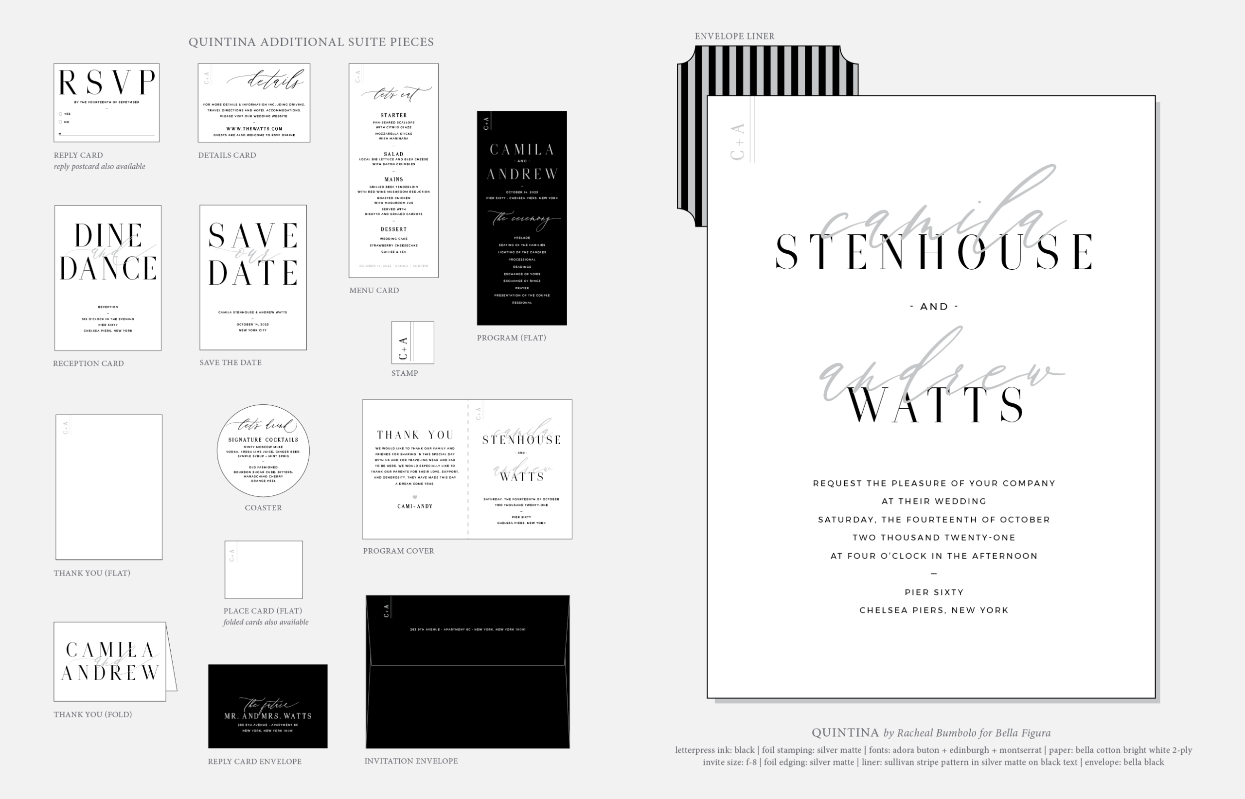 Retired Designs by Racheal Bumbolo for Bella Figuraletterpress ink: black | foil stamping: silver matte | fonts: adora buton + edinburgh + montserrat | paper: bella cotton bright white 2-ply | invite size: f-8 | foil edging: silver matte | liner: sullivan stripe pattern in silver matte on black (now ultra black) text | envelope: bella black (now ultra black)