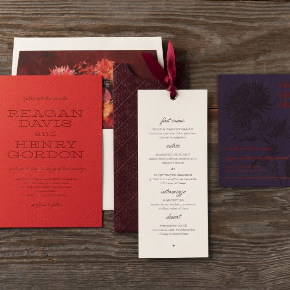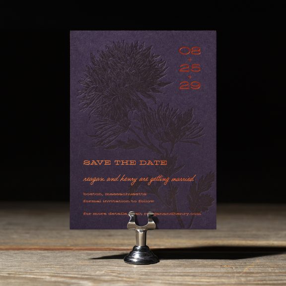 Save the Dates by Jessica Salisbury for Bella Figuraletterpress ink: plum | foil stamping: vermilion matte | fonts: tt globs + flimotype lacrosse | paper: eggplant 2-ply | card size: a-6 (tier 2) | foil edging: vermilion matte