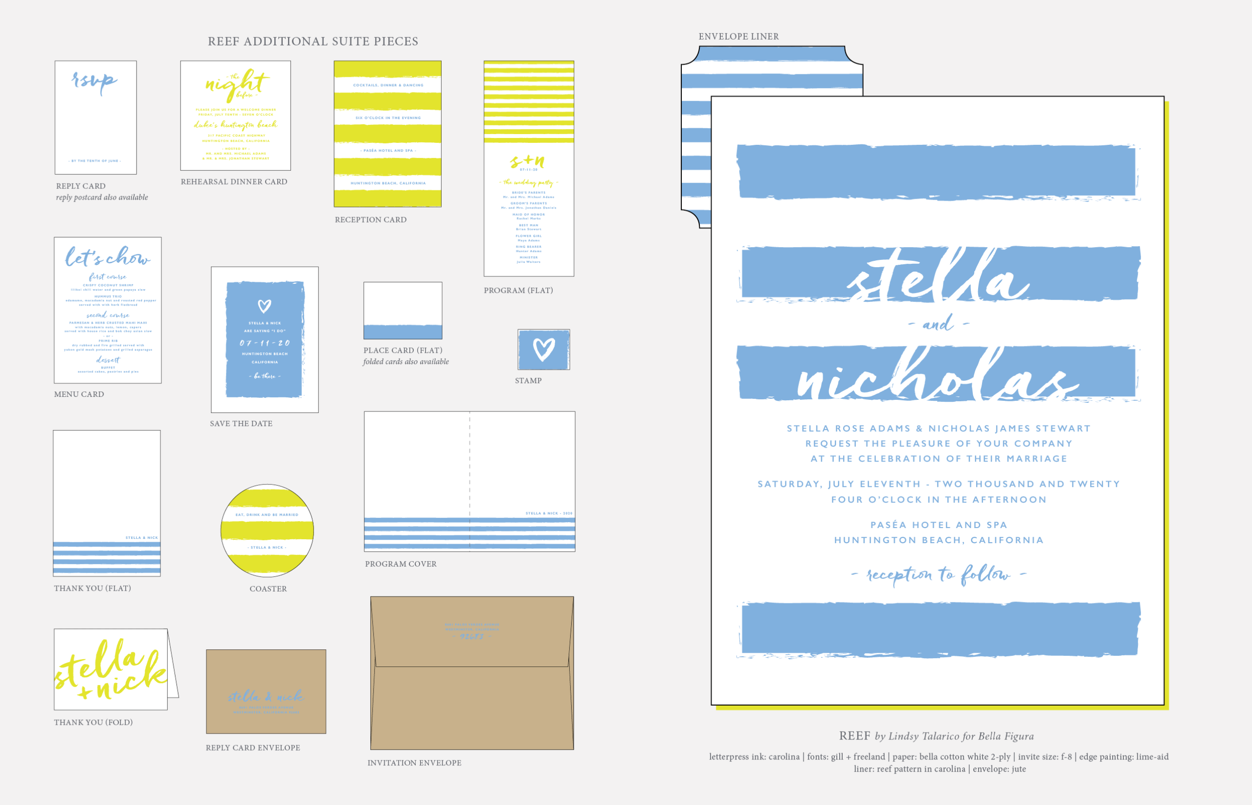 Retired Designs by Lindsy Talarico for Bella Figuraletterpress ink: carolina | fonts: gill + freeland | paper: bella cotton white 2-ply | invite size: f-8 | edge painting: lime-aid | liner: reef pattern in carolina | envelope: jute