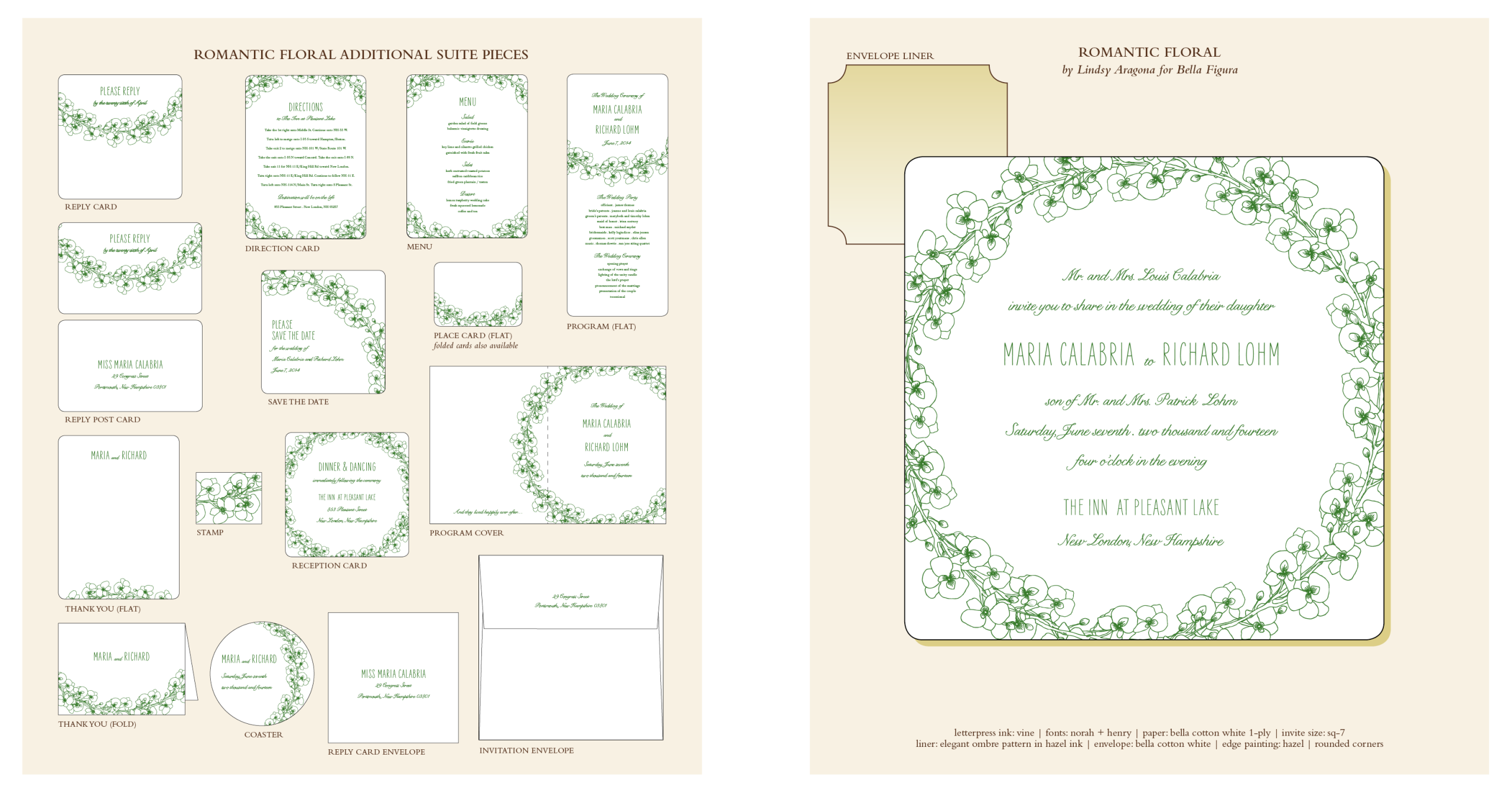 Wedding Invitations by Lindsy Talarico for Bella FiguraThis design from Lindsy Talarico is cute, eco chic, and blossoming with sweet bohemian enchantment. Often dancing wildly through spring meadows with her friends (who also happen to be letterpress wedding invitations), Romantic Floral is totally at peace in the natural world.